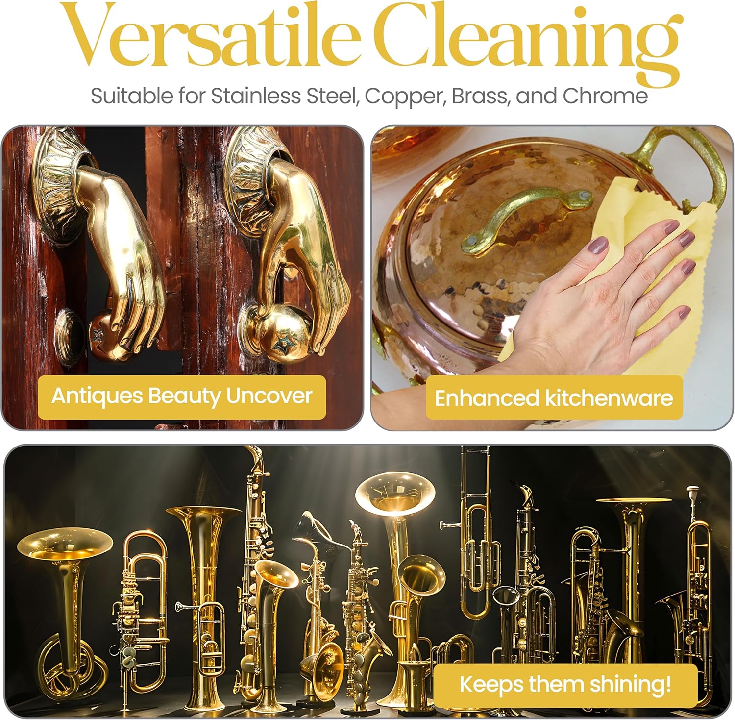 - COPPER AND BRASS: Bring back the shine to cookware, antiques, coins, doorknobs, levers, musical instruments, medals, and collectibles. Please be aware that a plated piece can be cleaned and shined with the metal care cloth. However, if the plating has worn out, the original tone can only be restored with a new plating. Antiques: it has taken a long time for an antique piece to change from the original tone of the metal. Removing the patina that covers the piece requires several cleanings. Focusing on one area at a time is a good practice.