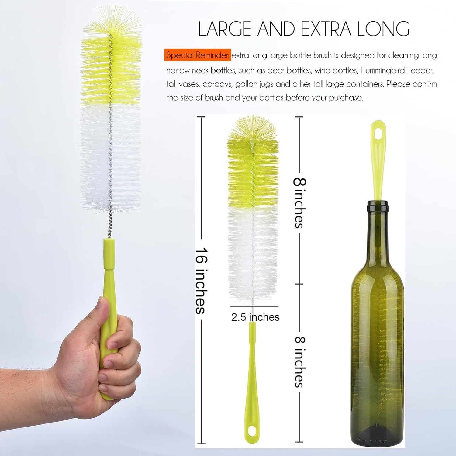- EXTRA LONG BOTTLE BRUSH - 16 inches extra long brush make it easy to clean long narrow neck beer bottles, wine bottles, kombucha , crafes, decanter, Sport well, brewing and tall bottles