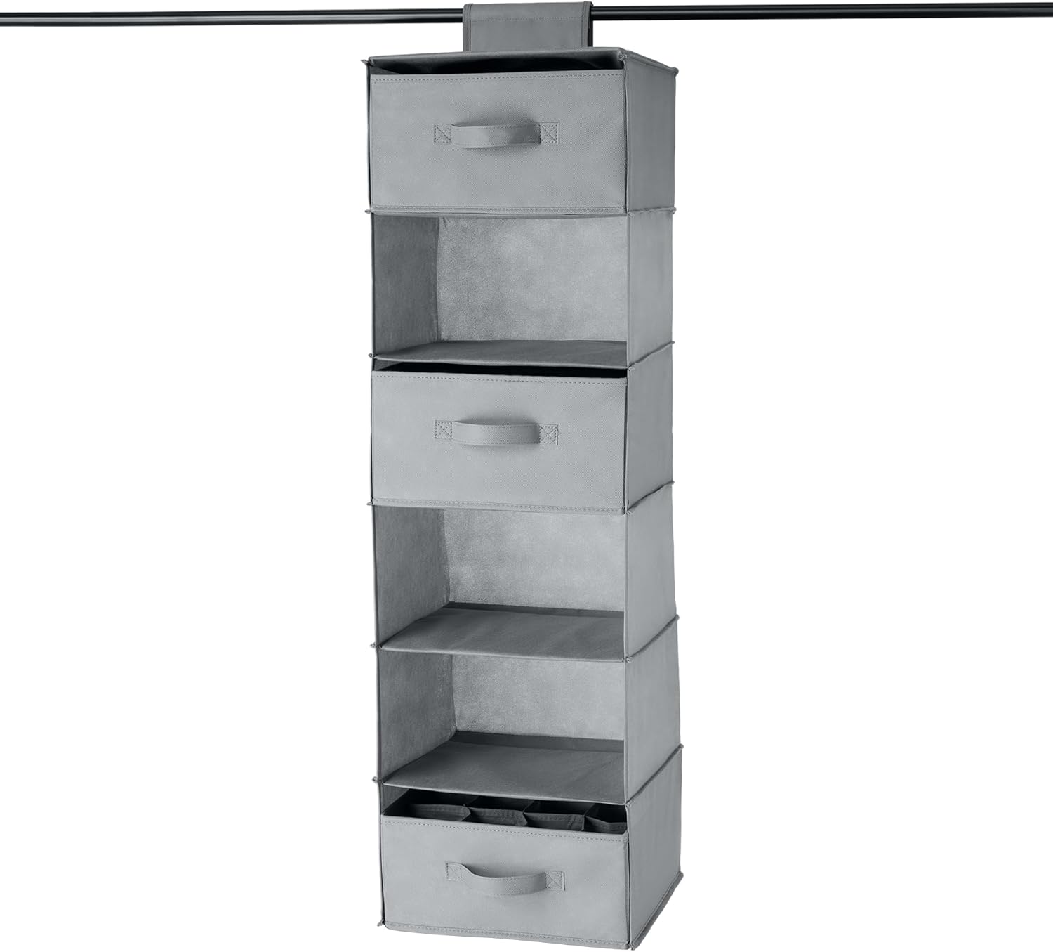 Amazon Basics 6-Tier Hanging Shelf Closet Storage Organizer with Removable Drawers, Grey, 6.9"D x 13.6"W x 12.2"H