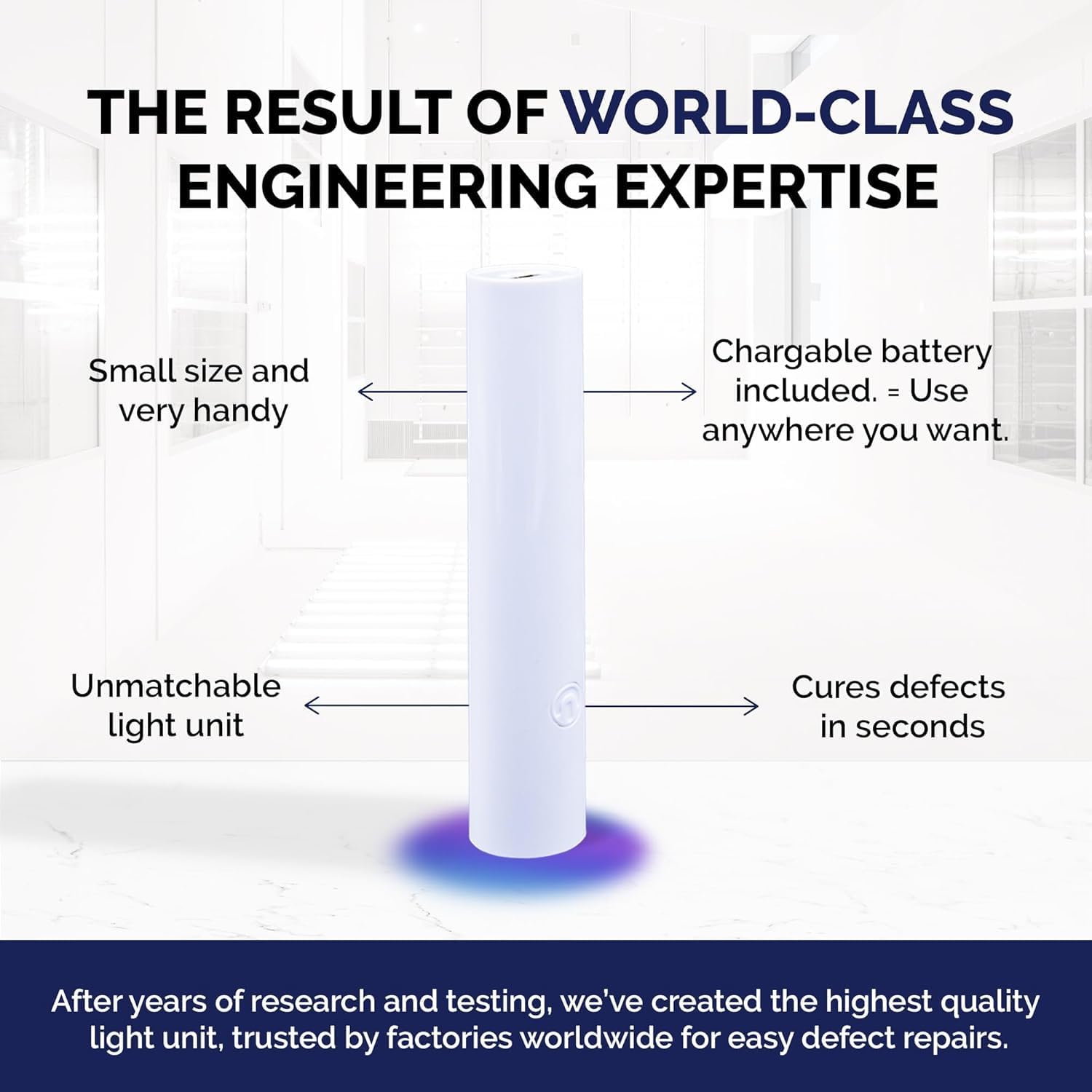 - PRO LIGHT UNIT FOR QUICK REPAIRS: After filling in the chip, simply shine the included blue light on it and the filler will harden in just 20 seconds. No need to stand around with a keychain light, the one included plugs into a wall for maximum power.