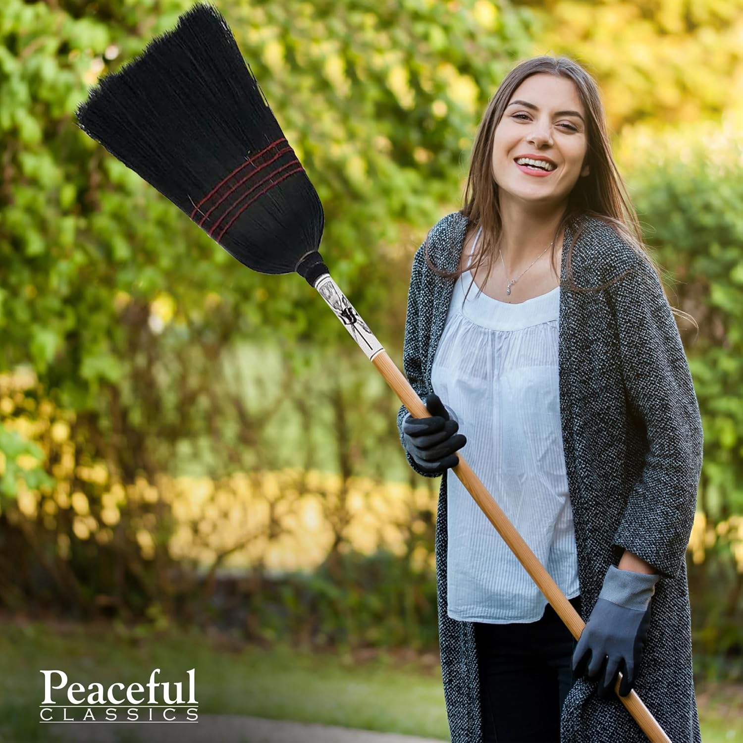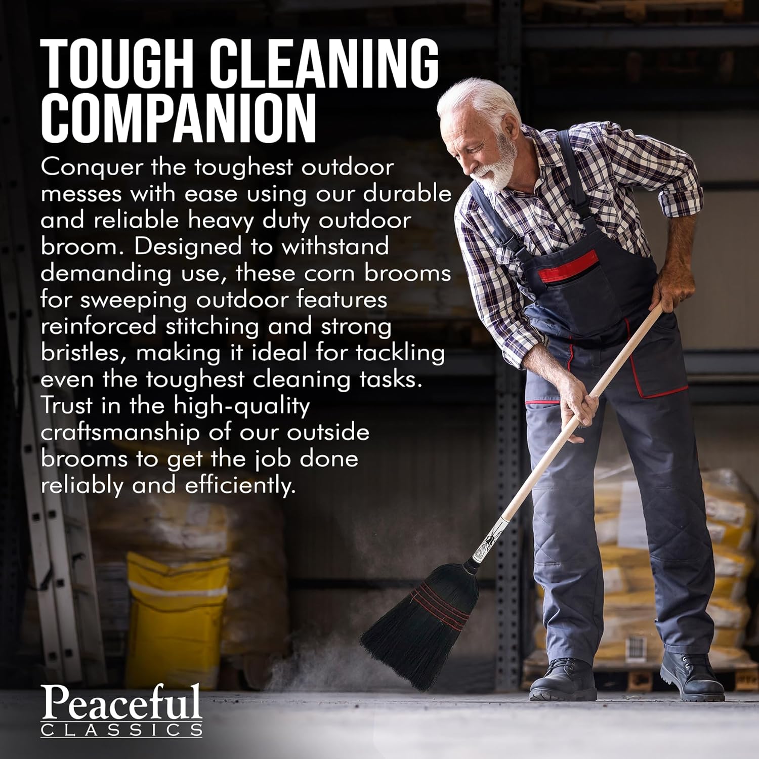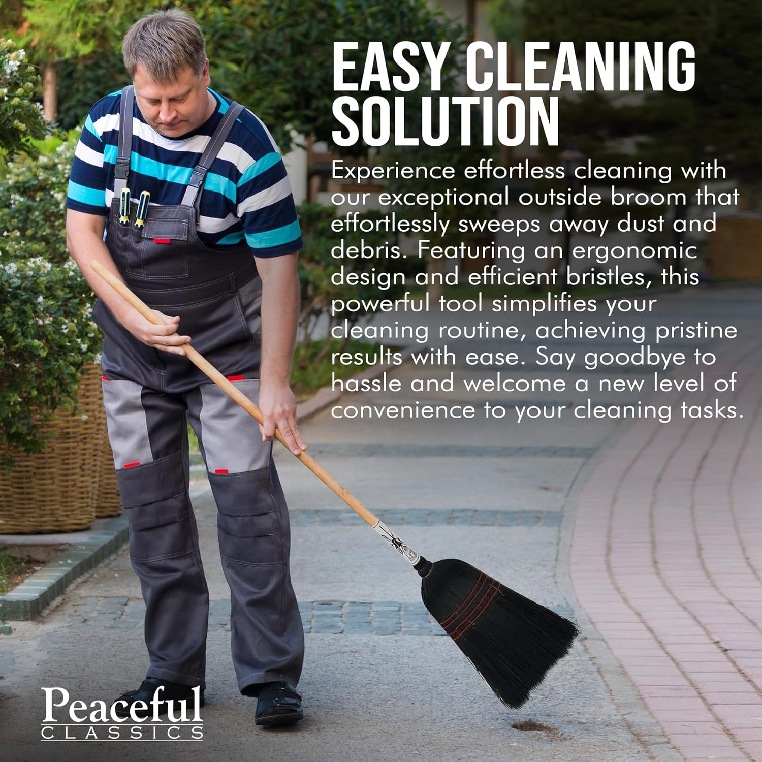 - GREAT SIZE: Peaceful Classics indoor and outdoor broom is sized perfectly with dimensions of 57” long, along with a broom head 19" long and 12" inches wide. The wood broom handle is 1 ¼” thick. Use the wooden broom stick with ease and take the hassle and frustration out of cleaning!