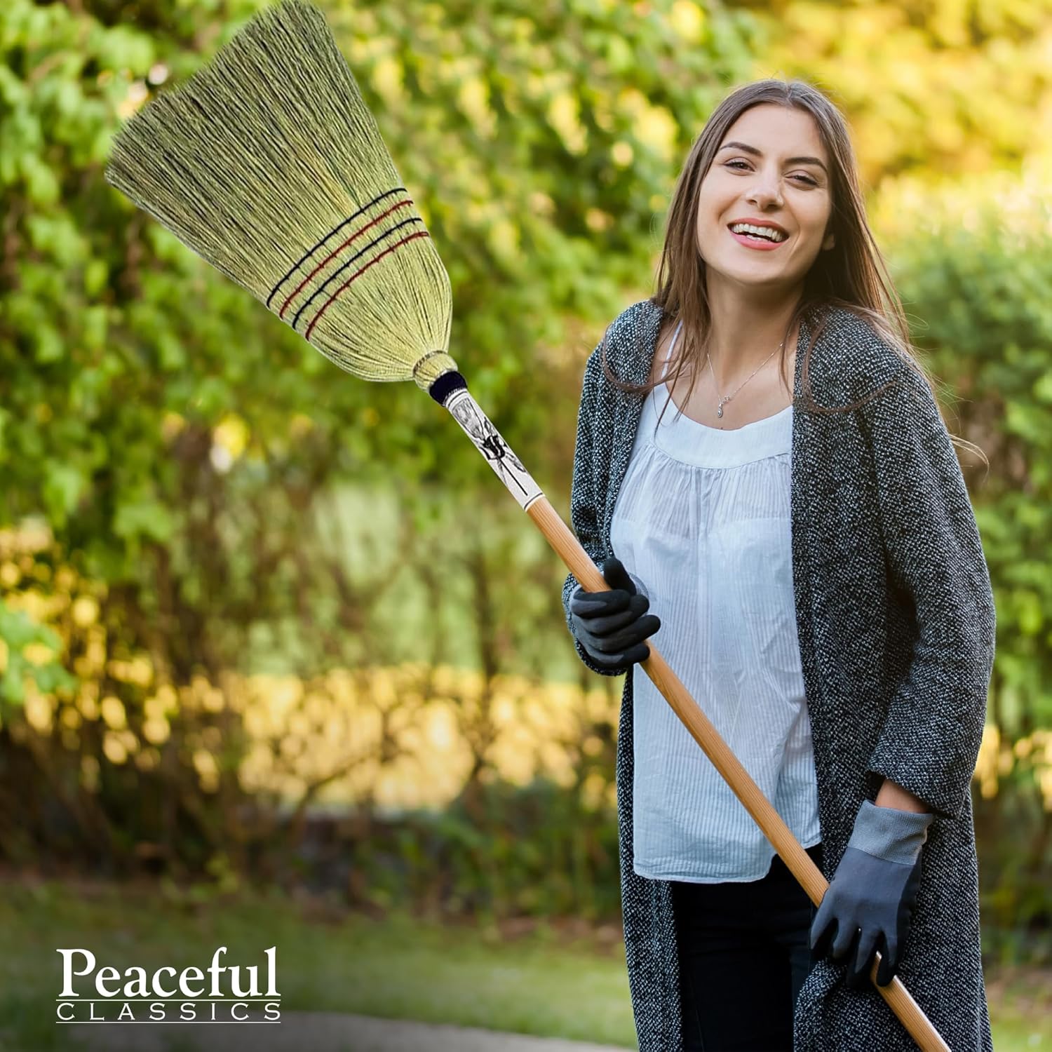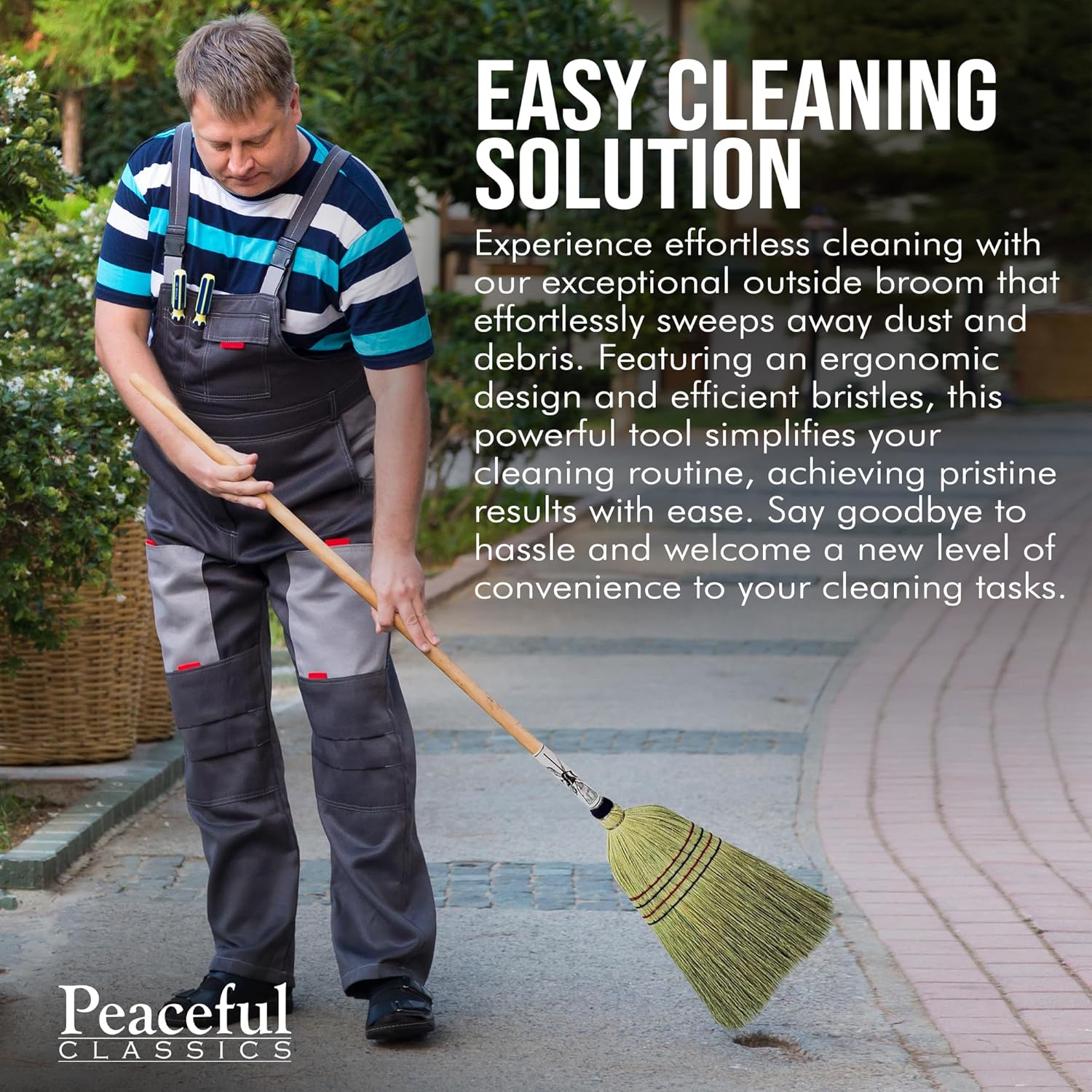 - GREAT SIZE: Peaceful Classics indoor and outdoor broom is sized perfectly with dimensions of 57” long, along with a broom head 19" long and 12" inches wide. The wood broom handle is 1 ¼” thick. Use the wooden broom stick with ease and take the hassle and frustration out of cleaning!