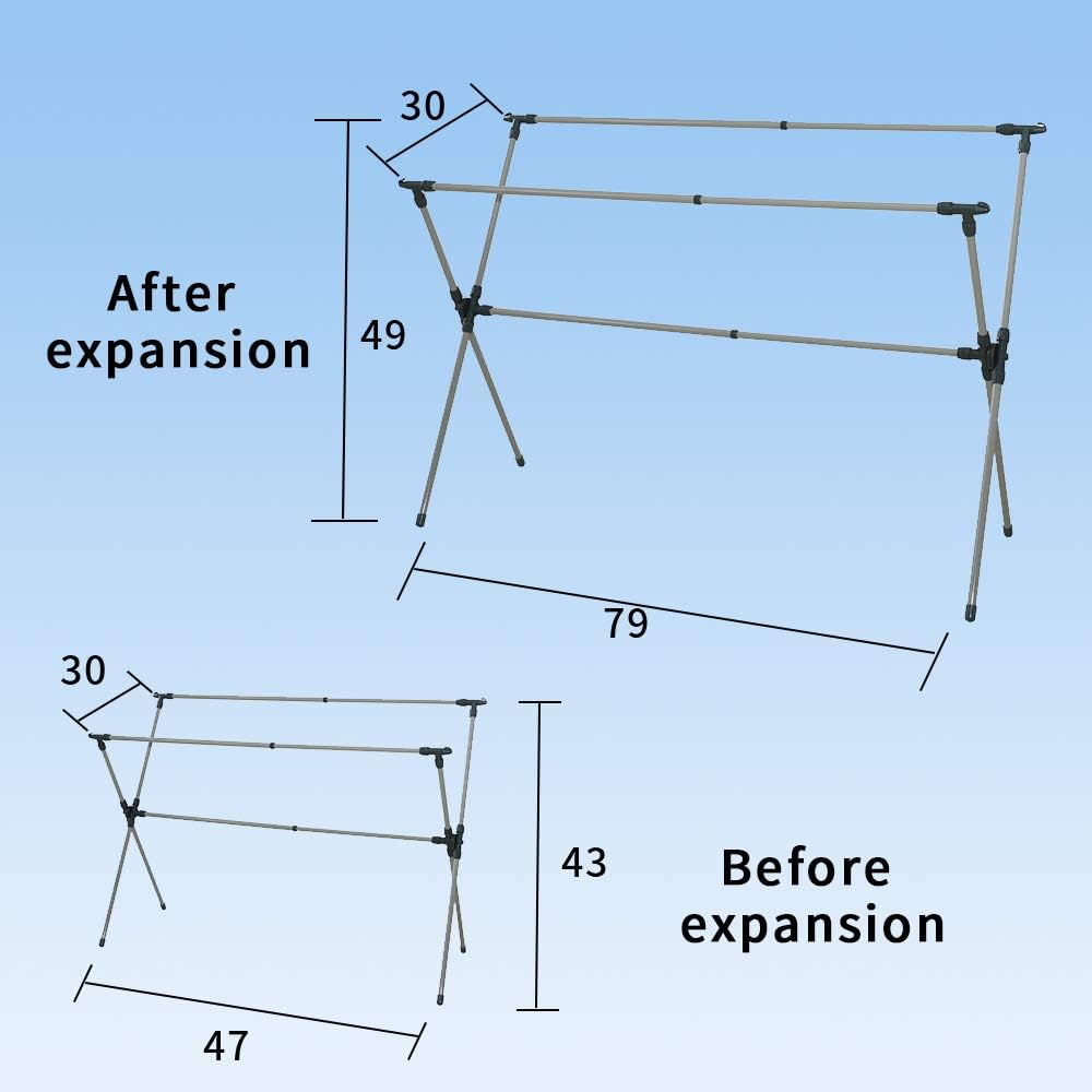 - Extensible Horizontal Rods: The Length can stretchable from 47 to 79inch, hight can stretchable from 43 to 49 inches, the Max Size is 79x30x49 inches. Let the quilts, pants, shoes, and clothes fully exposed to the sun, and quickly dry them in a large area