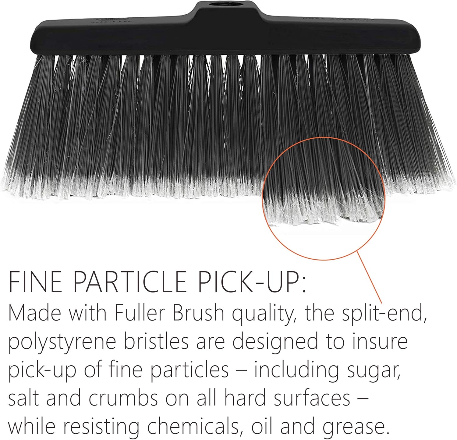 - FINE PARTICLE PICK-UP: Made with Fuller Brush quality, the split-end, polystyrene bristles are designed to insure pick-up of fine particles – including sugar, salt and crumbs on all hard surfaces – while resisting chemicals, oil and grease.