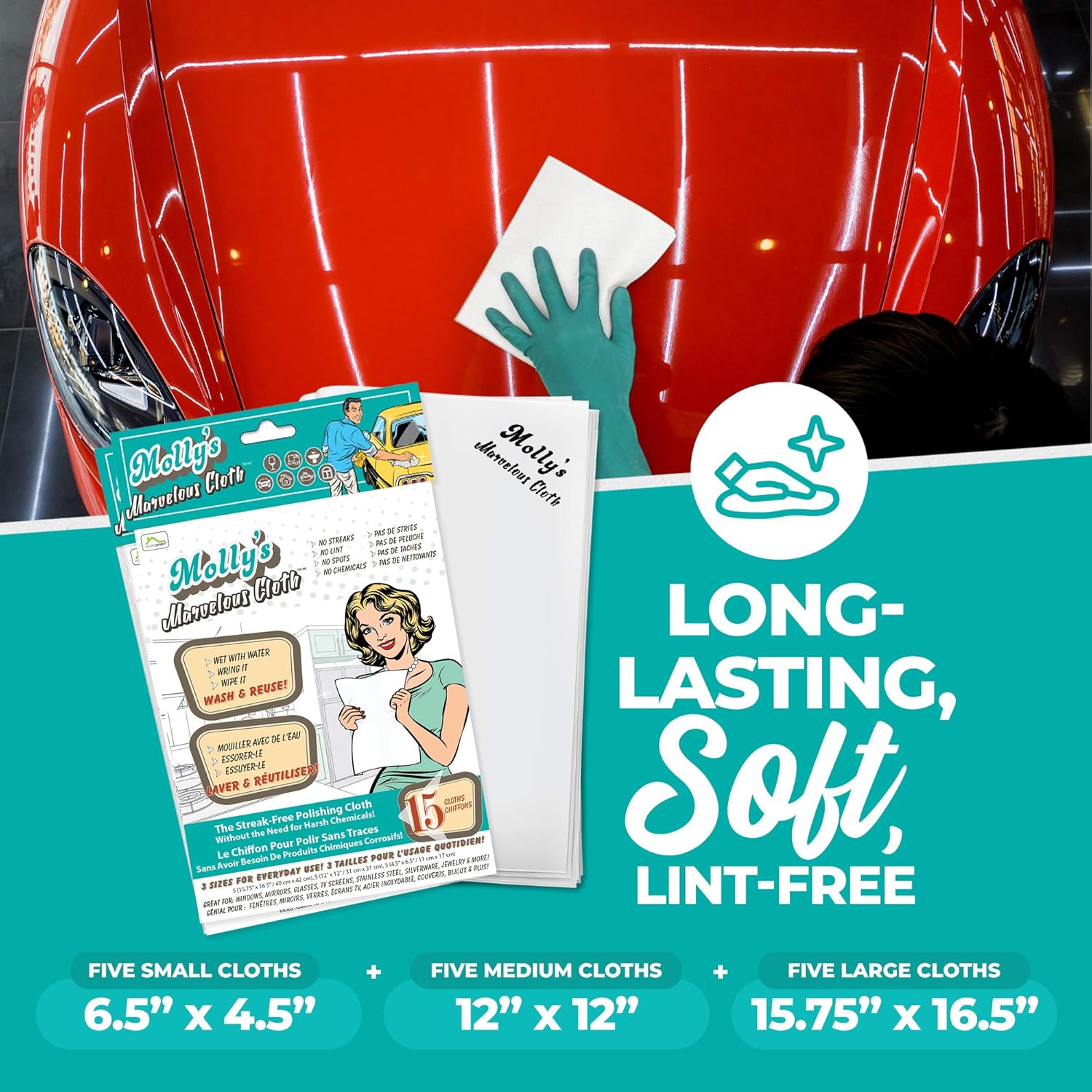Molly's Marvelous Cloth, Streak-Free, Lint-Free Microfiber Cleaning Cloth, Polishing Cloth for Glass, Stainless Steel, Use for Kitchen, Bath, Cars, Detailing, Reusable (15.75" by 16") (15pk, White)