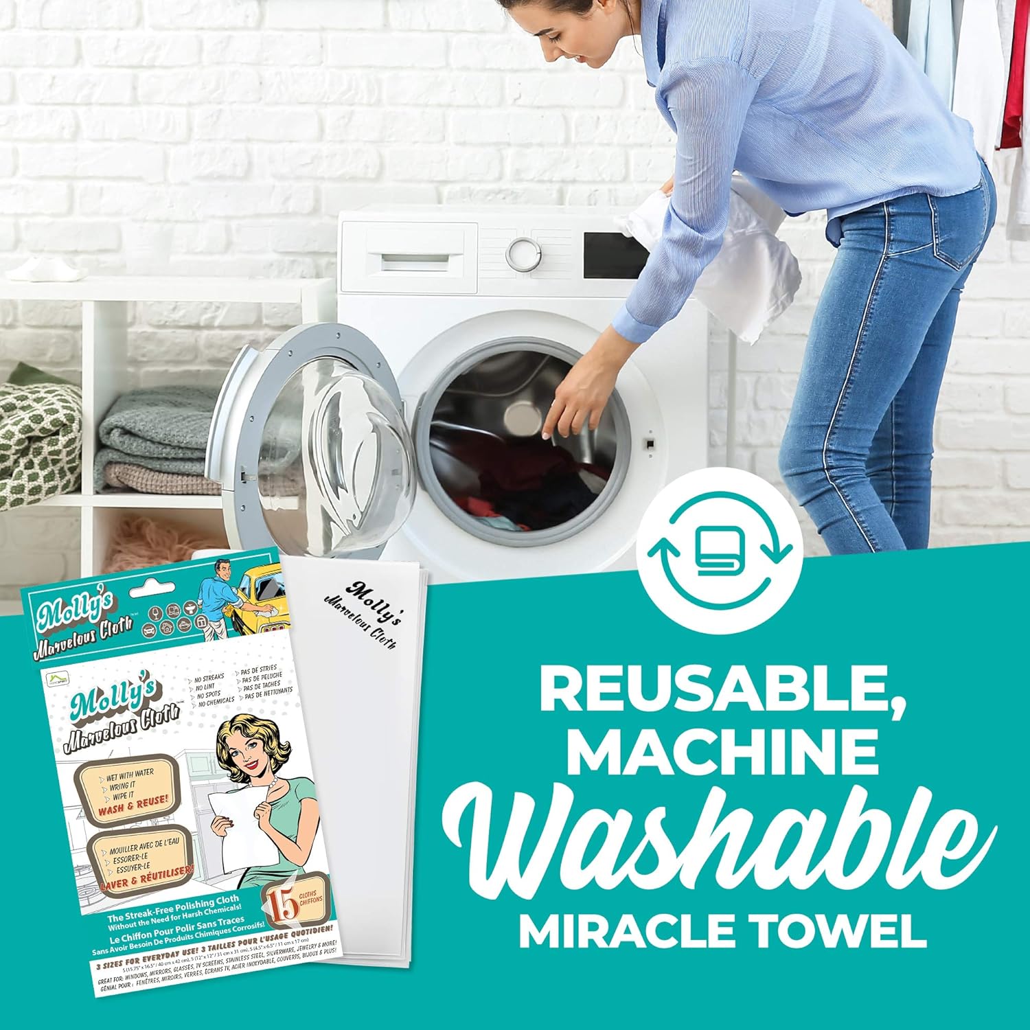 - NO MORE CHEMICALS, USE WATER ONLY, save your sprays, paper towels and cleaners, simply wet it, wring it and wipe! No more chemicals, no more soggy towels and no more smelly rags. Just a mirror shine every time. Molly’s is great in any room of the house and any surface you want to clean or polish. In the living room Molly’s is great for dusting and polishing fine wood or table tops and easily cleans and polishes all your televisions, tablets, phones and computers in record time.