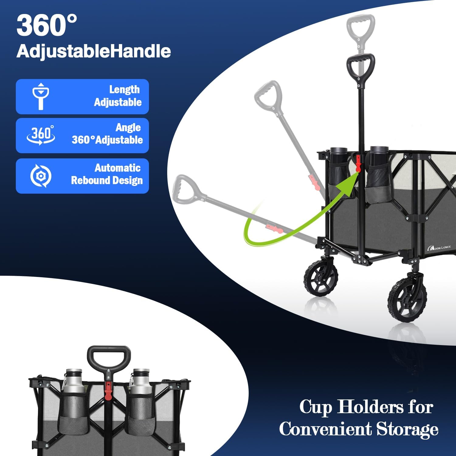 - All-Terrain Versatility: Outfitted with four all-terrain wheels, including two 360° swiveling front wheels, for easy movement on any surface. The adjustable handle offers smooth control even when loaded, making this folding wagon perfect for shopping, gardening, picnics, camping, or sports events, whether you’re exploring with a wonderfold wagon