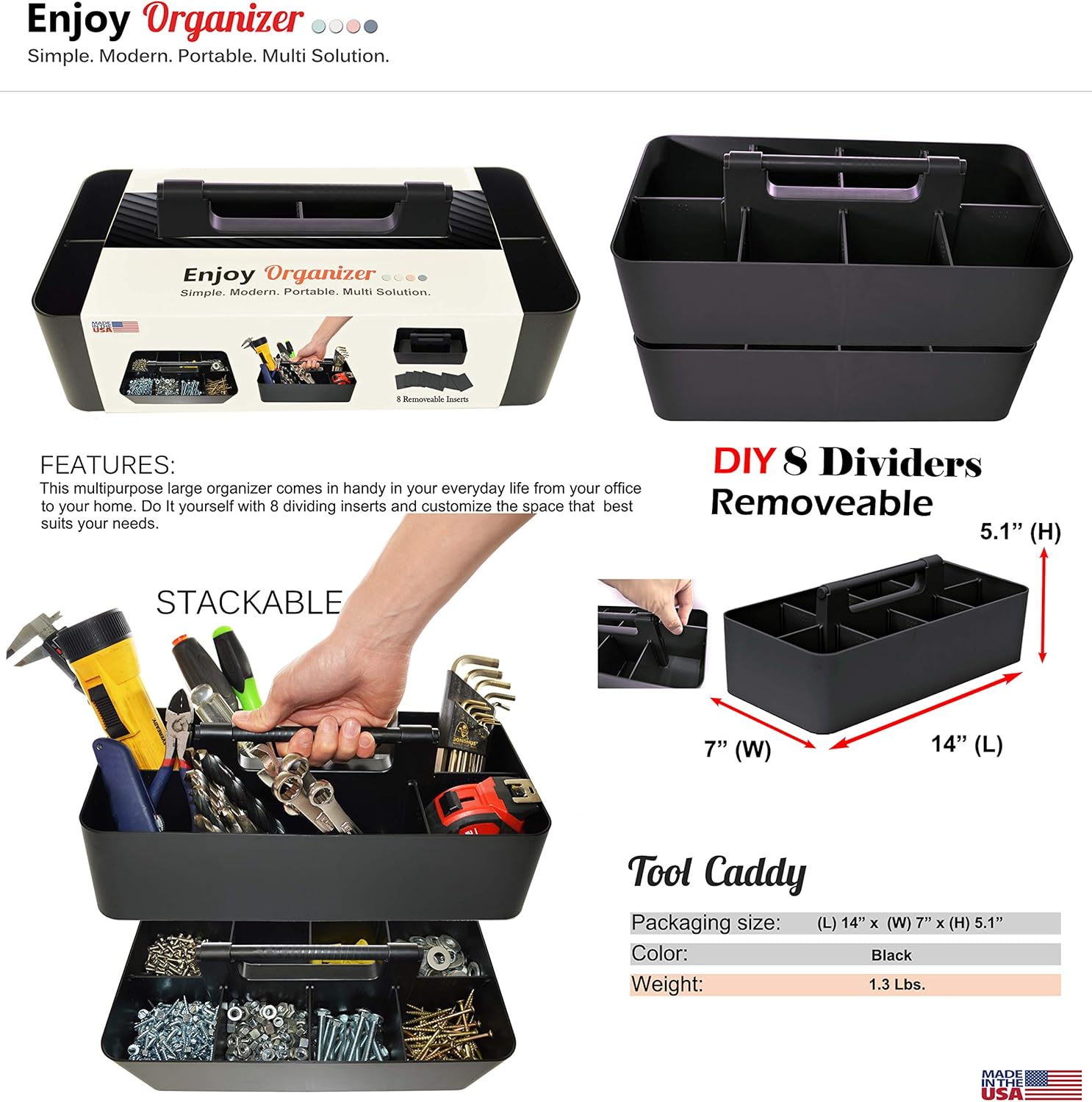 2 PACK - Portable DIY 8 Dividers Durable Plastic Tote Tool & Supply Cleaning Caddy with Handle Made In USA (Black)