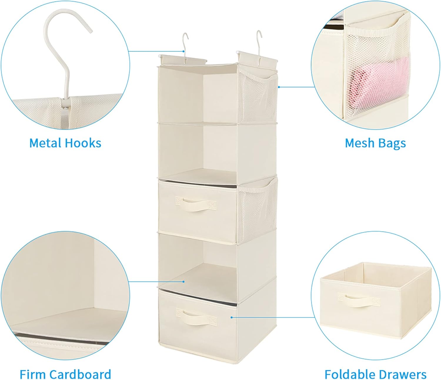 MAX Houser 5 Tier Shelf Hanging Closet Organizer, Cloth Hanging Shelf with 2 Sturdy Hooks for Storage, Foldable (Beige-D2)