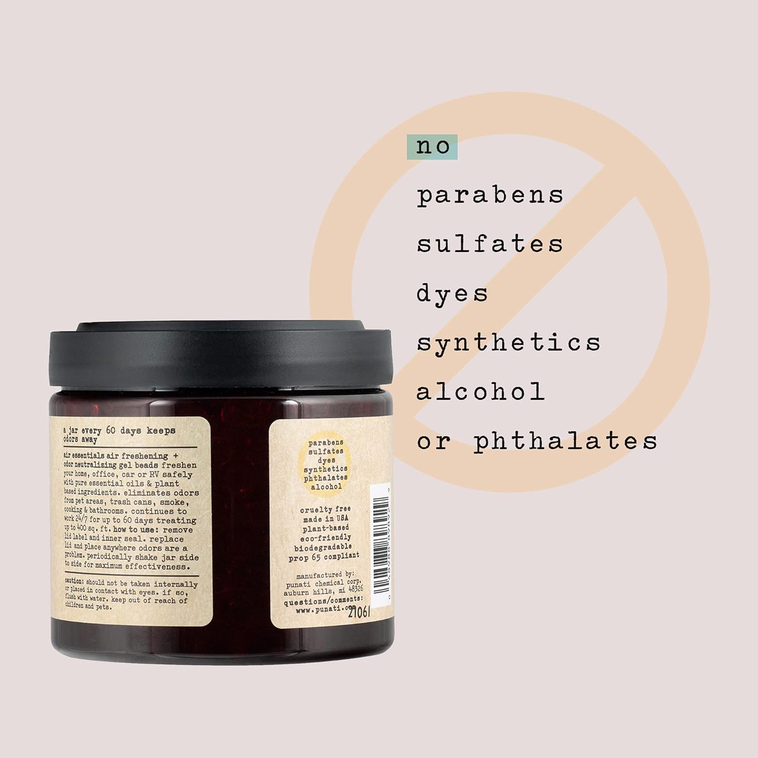 - MADE IN THE USA - Air Essentials Gel Beads do not contain parabens, sulfates, dyes, synthetics, alcohol or phthalates. Every jar is proudly Made in the USA and is formulated with plant derived ingredients.