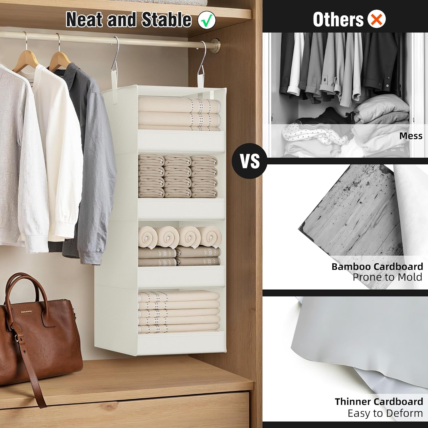 - Easy to Use: Equipped with two sturdy metal hooks, which are more stable than Velcro-fixed closet organizers and storage hanging, just hang the hooks on various closet rods or hangers to use.