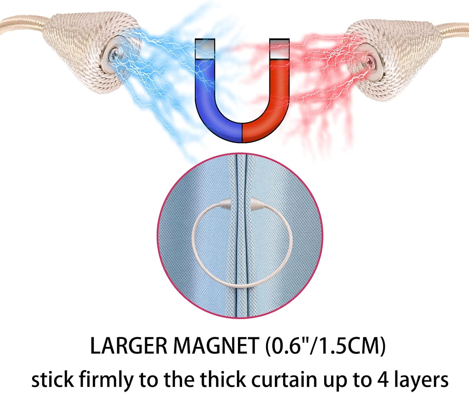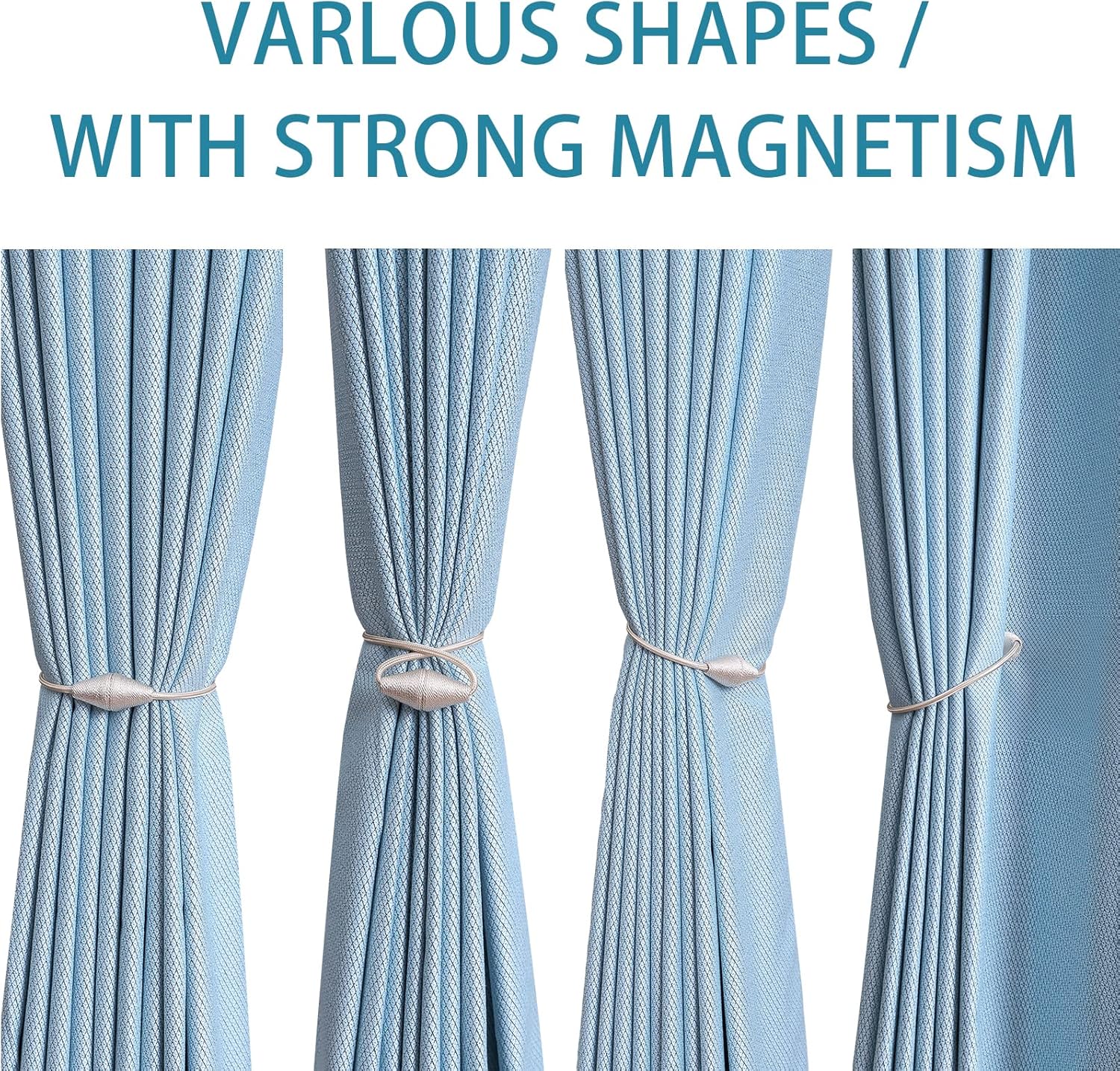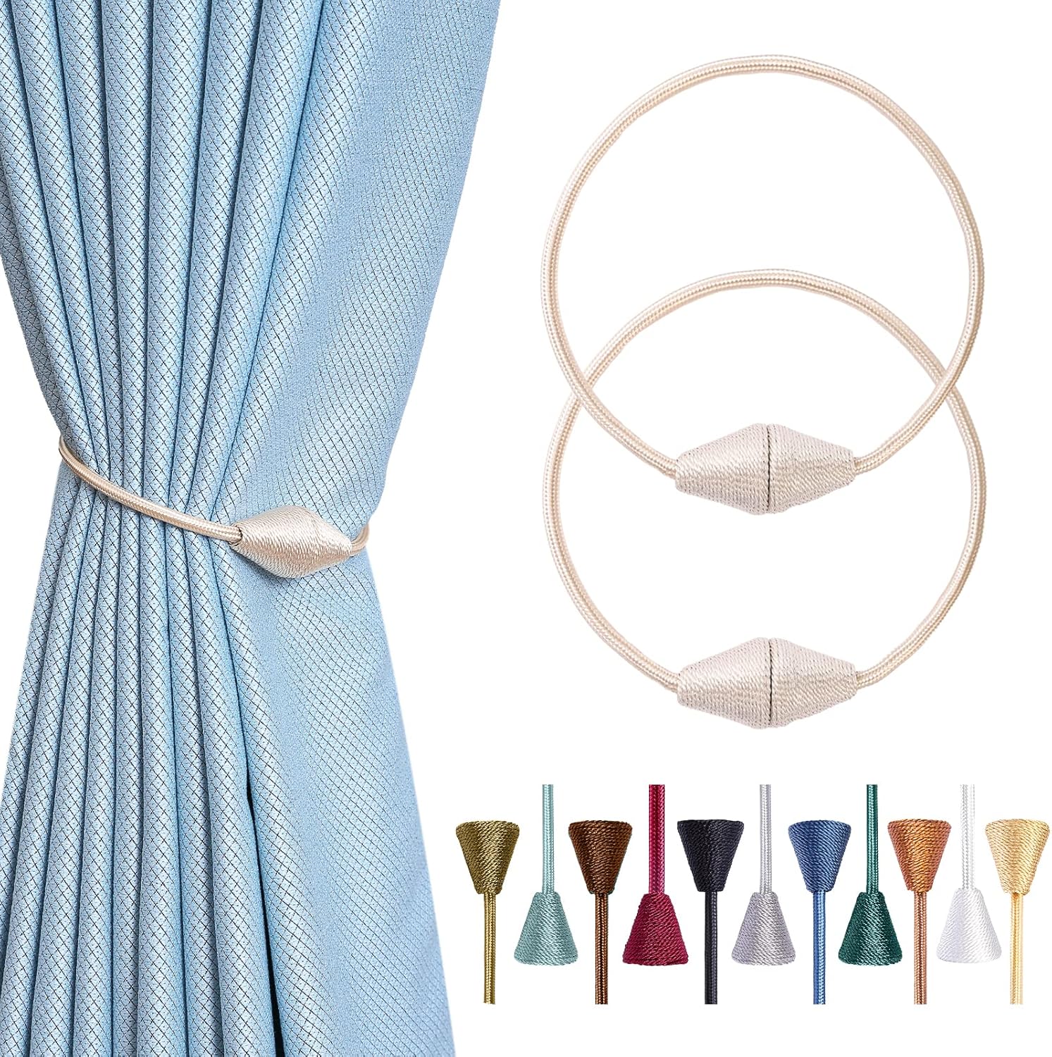- WIDE APPLICATION: The length and binding method can be adjusted freely according to the thickness of the curtain. It is widely used in curtains in different places such as bedroom, living room, dining room, bathroom, kitchen, office, courtyard and so on. Different colors of magnetic drape tiebacks adorn your curtains, which can change different styles, giving the curtains a unique charm