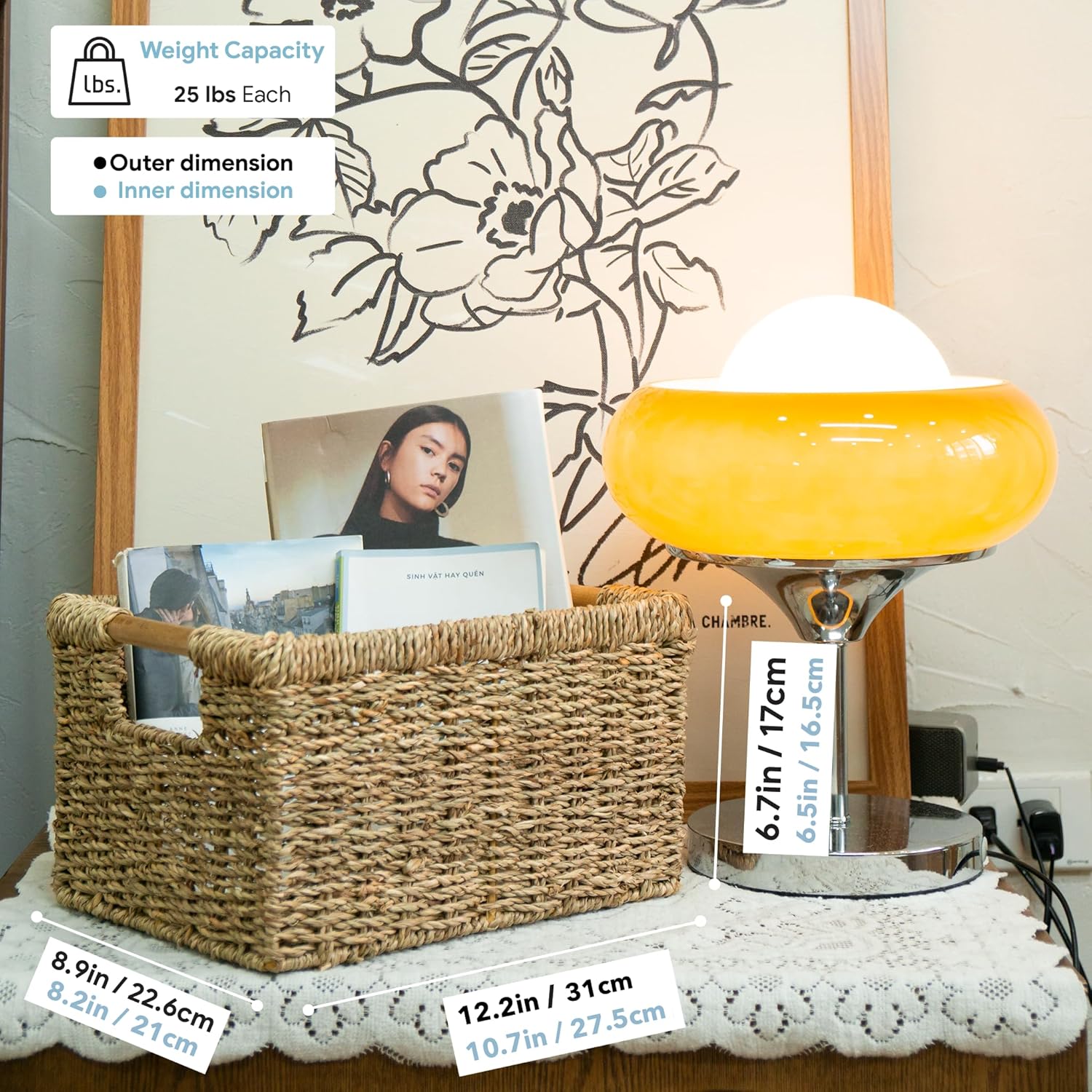 - ✅ Medium Wicker Basket: 12.2"L x 8.9"W x 6.7"H. These wicker baskets are convenient and easy to storage for drawers, shelves, desks, or anywhere in the house. Please kindly make allowances for slight variations due to the handcrafted nature of these goods. Just use a damp cloth and wipe it gently for cleaning.