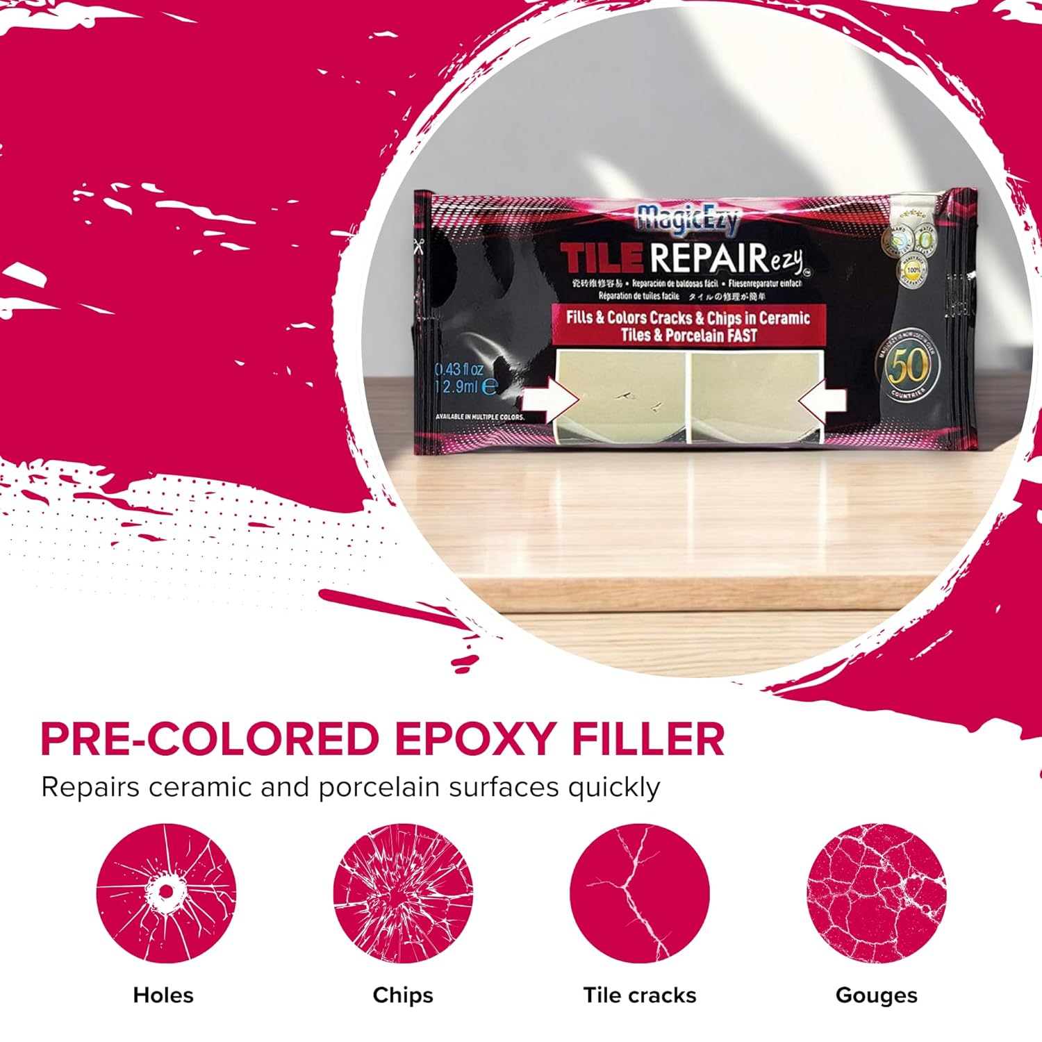 MagicEzy Tile RepairEzy (Light Gray/White Kit) - Porcelain Tile Repair Kit - Fix Cracked or Chipped Ceramic Tiles Fast - Thick Structural Repair Filler, Putty and Adhesive for Tiles