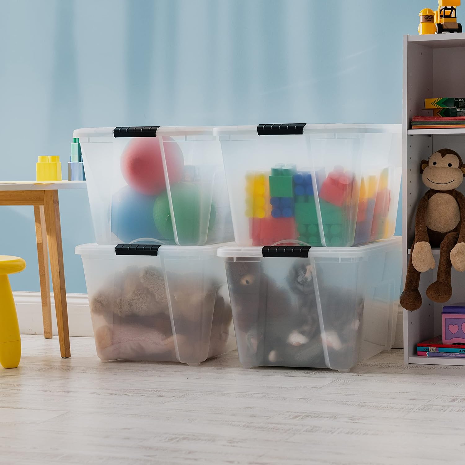 IRIS USA 54 Qt Stackable Plastic Storage Bins with Lids, 4 Pack - BPA-Free, Made in USA - See-Through Organizing Solution, Latches, Durable Nestable Containers, Secure Pull Handle - Clear