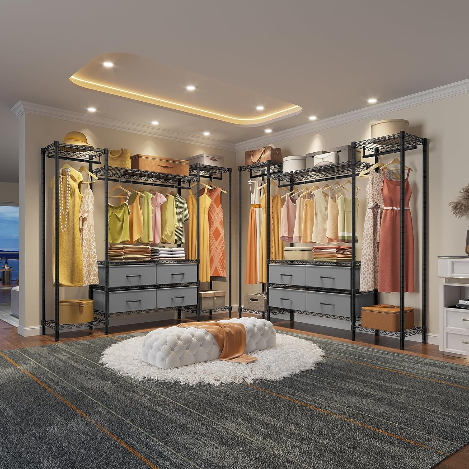 - All-in-one Multifunction Closet Rack: 6 Tiers Garment Rack V20 with compact design offers you various storage area to place your clothes, accessories, shoes, etc. It features 6 height adjustable shelves for extra storage capacity, 3 detachable hanging bars that easily accommodates to the length and size of your garments and 4 fabric drawers with wooden handles which makes it easy to grab and pull from shelves.
