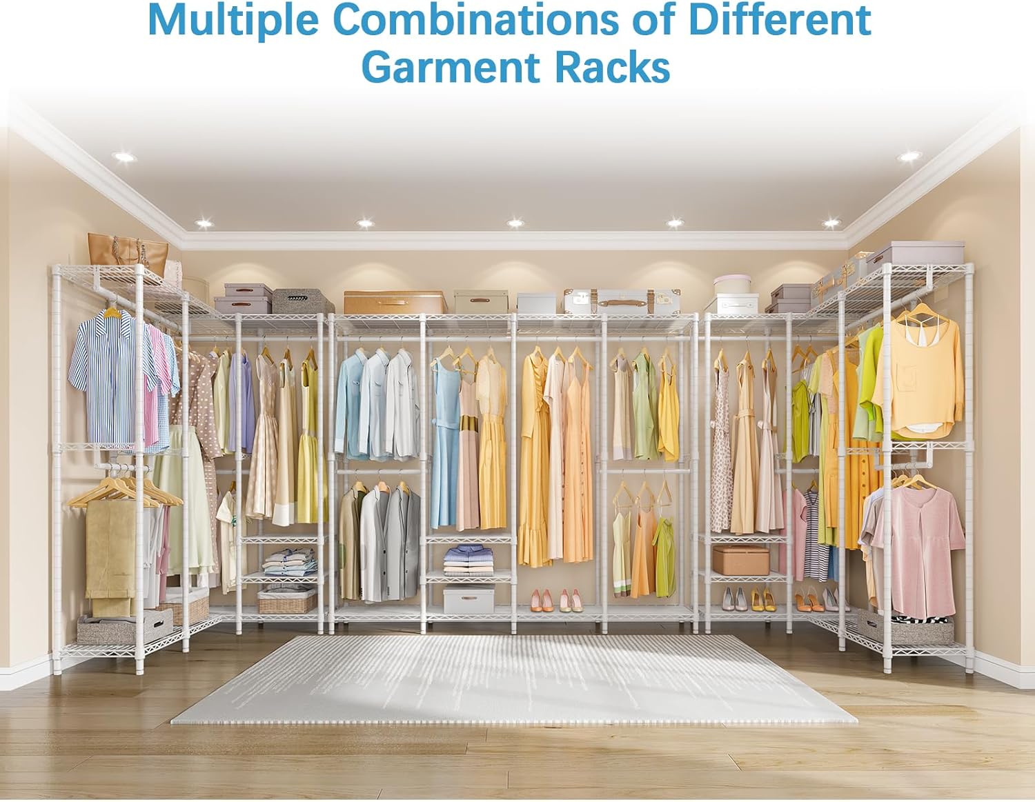 - All-in-one Multifunction Closet Rack: 4 Tiers Extra Large Garment Rack V40 offers you various storage area to place your clothes, accessories, shoes, etc. It features 6 height adjustable shelves for extra storage capacity, 4 detachable hanging bars that easily accommodates to the length and size of your garments.