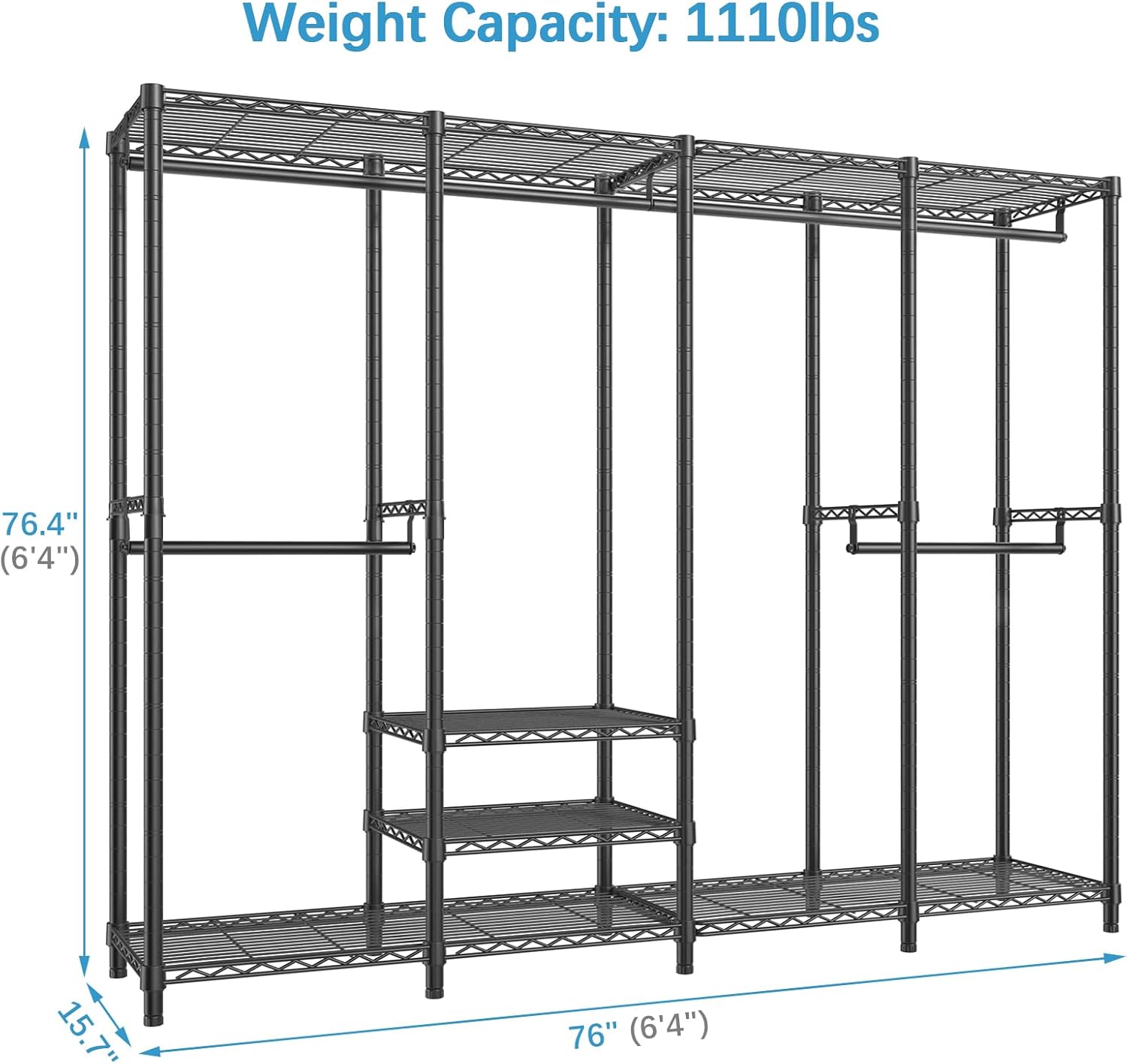 - Dimensions & Load Capacity: 76" L x 15.7" W x 76.4" H. Load capacity up to 1110 lbs. Single hanging rod can support up to 75 lbs, wire shelf can support up to 88 lbs for each.