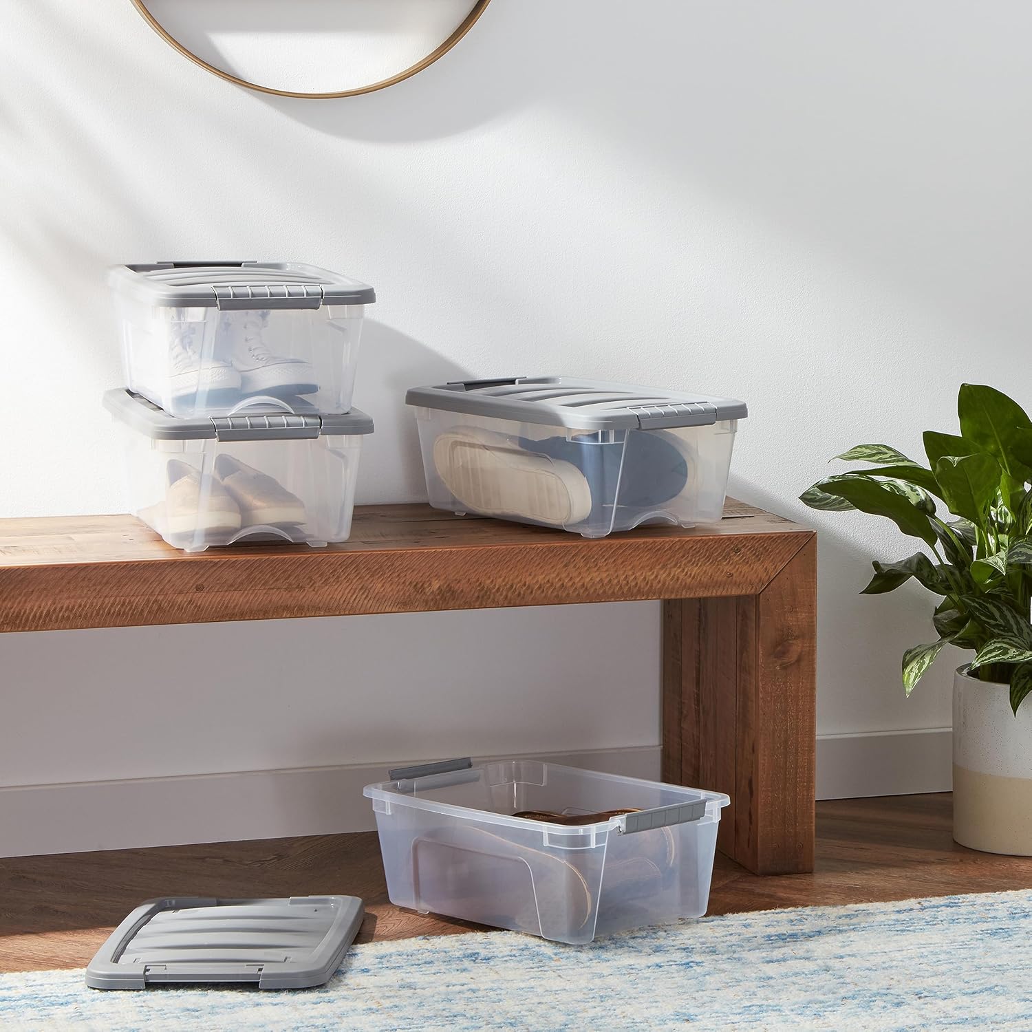 - CLEAR BINS: Our clear plastic storage bins with grey lids allow for quick visual identification of contents, enhancing organization