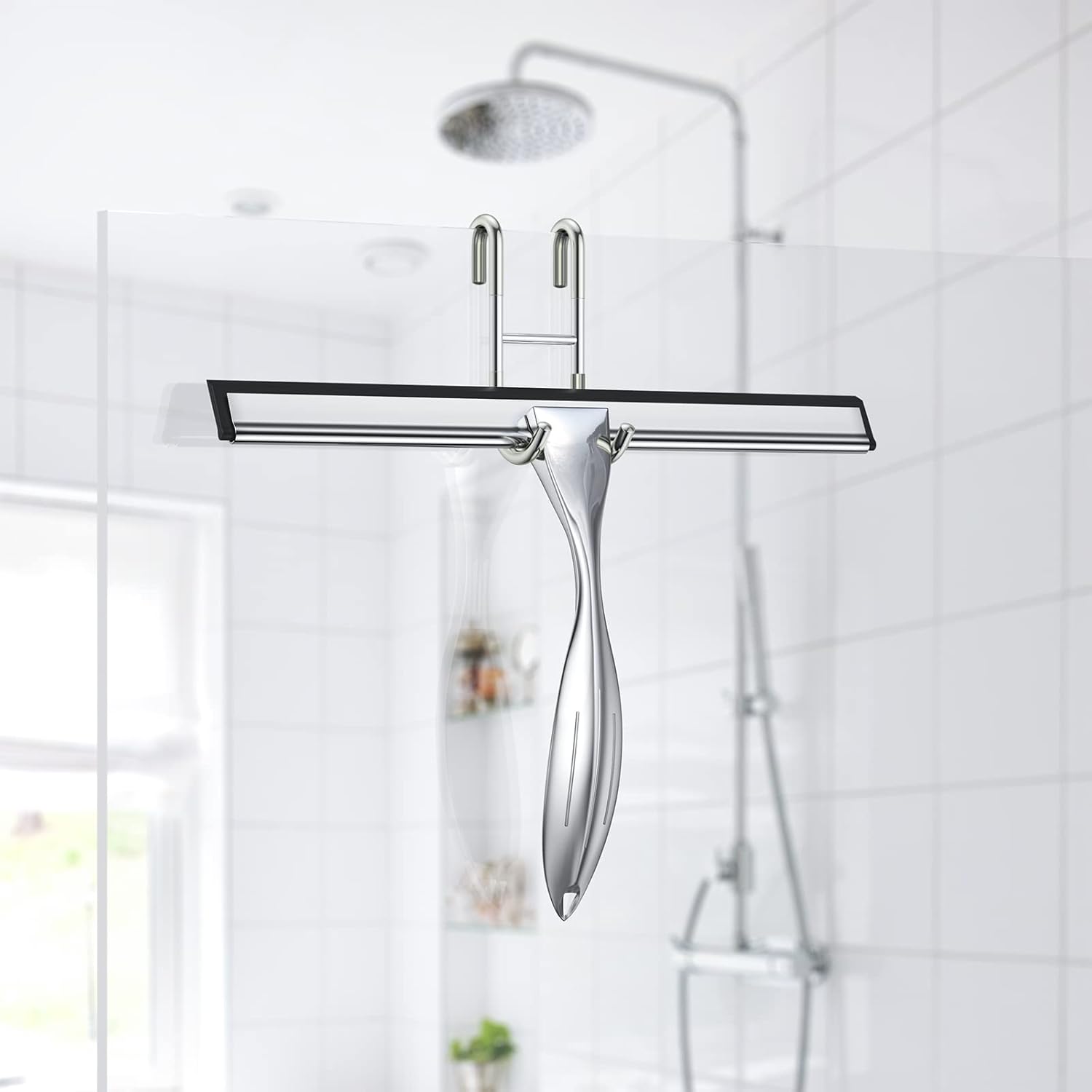 - EASY TO INSTALL AND STORE: The shower squeegee wiper can be stored almost anywhere for quick use. Smart design with an additional hole on the bottom of the silicone shower squeegee, allows you to hang it without the adhesive holder. And comes with an S-Shape hanger hook for the frameless shower door, removable and no drilling is needed. Even for your frame shower door, we include a strong self-adhesive holder that can be applied directly to clean indoor surfaces for easy squeegee hanging