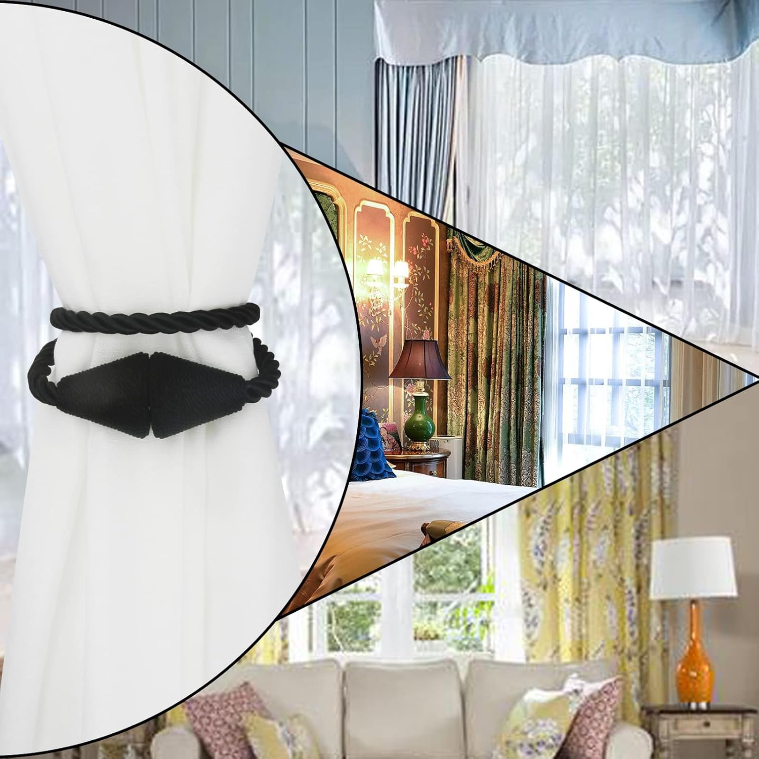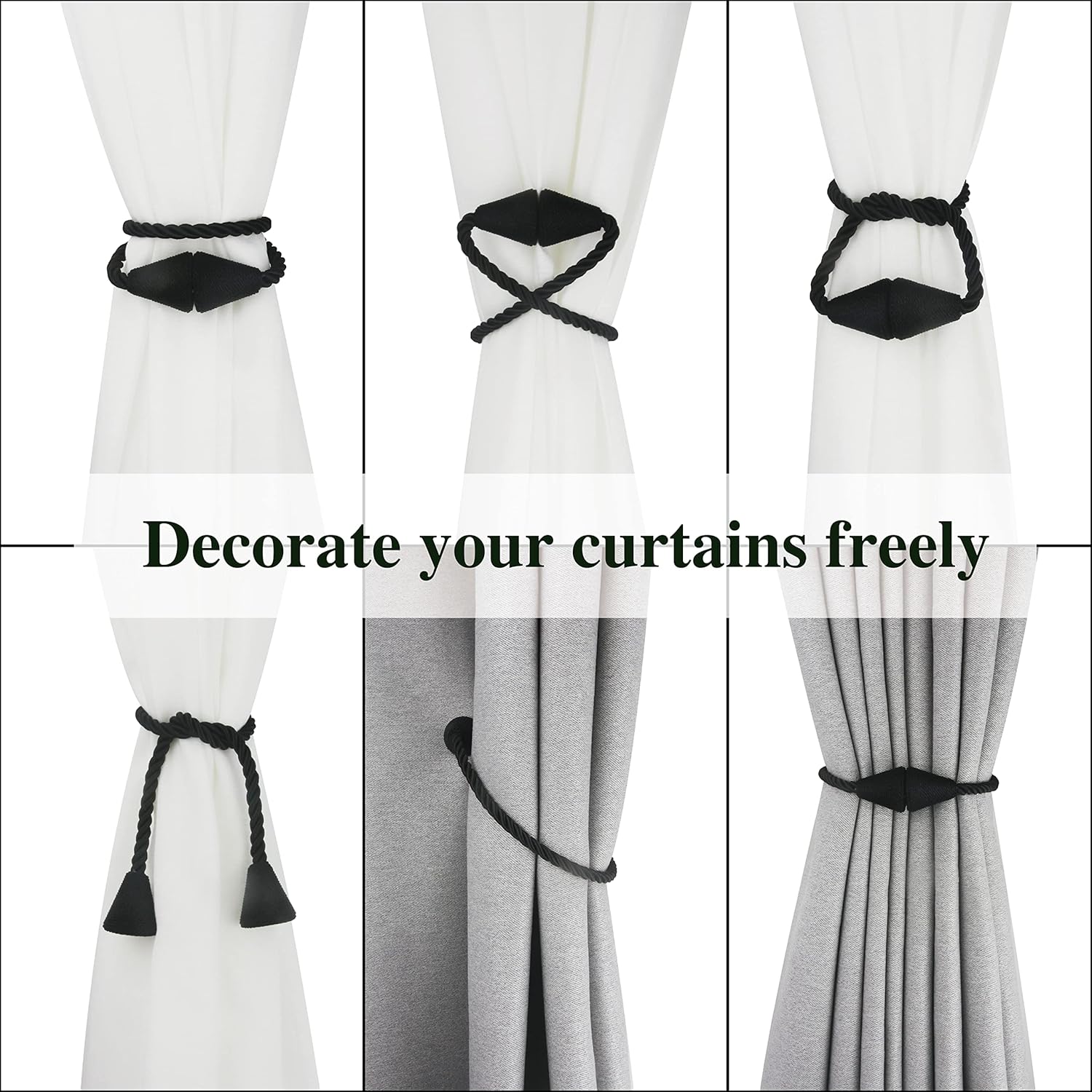2 Pack Magnetic Curtain Tiebacks Rope Modern Handmade Curtain Tie Backs Decorative Drapes Weave Holdbacks for Window Décor, Black