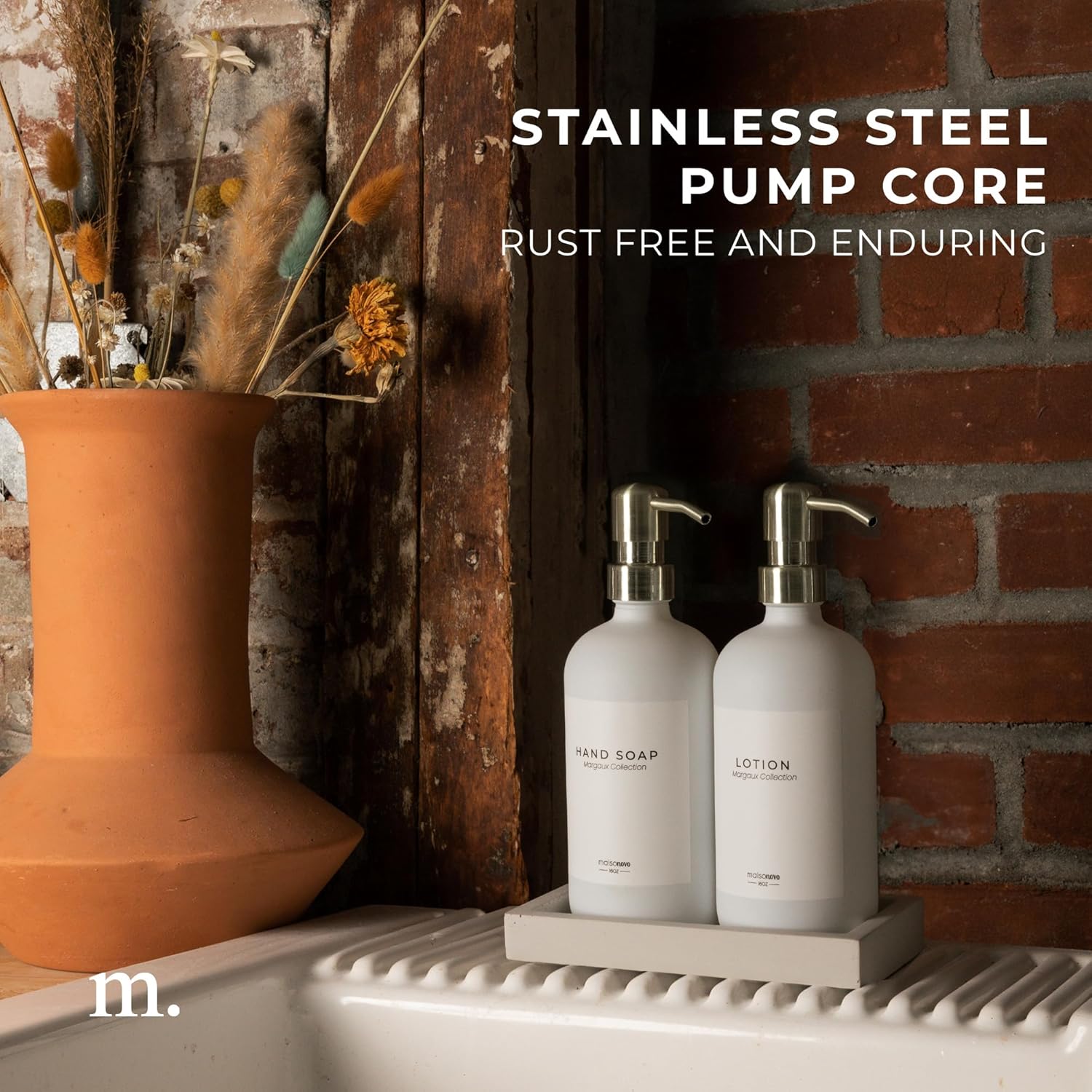 - This Pack Includes: Two white glass soap dispensers, which can hold 16.9 fl oz/500ml, with silver stainless steel pumps, a concrete tray, and durable waterproof labels (hand soap, body wash, dish soap, lotion, shampoo, conditioner), ensuring both style and practicality for your bathroom sink.