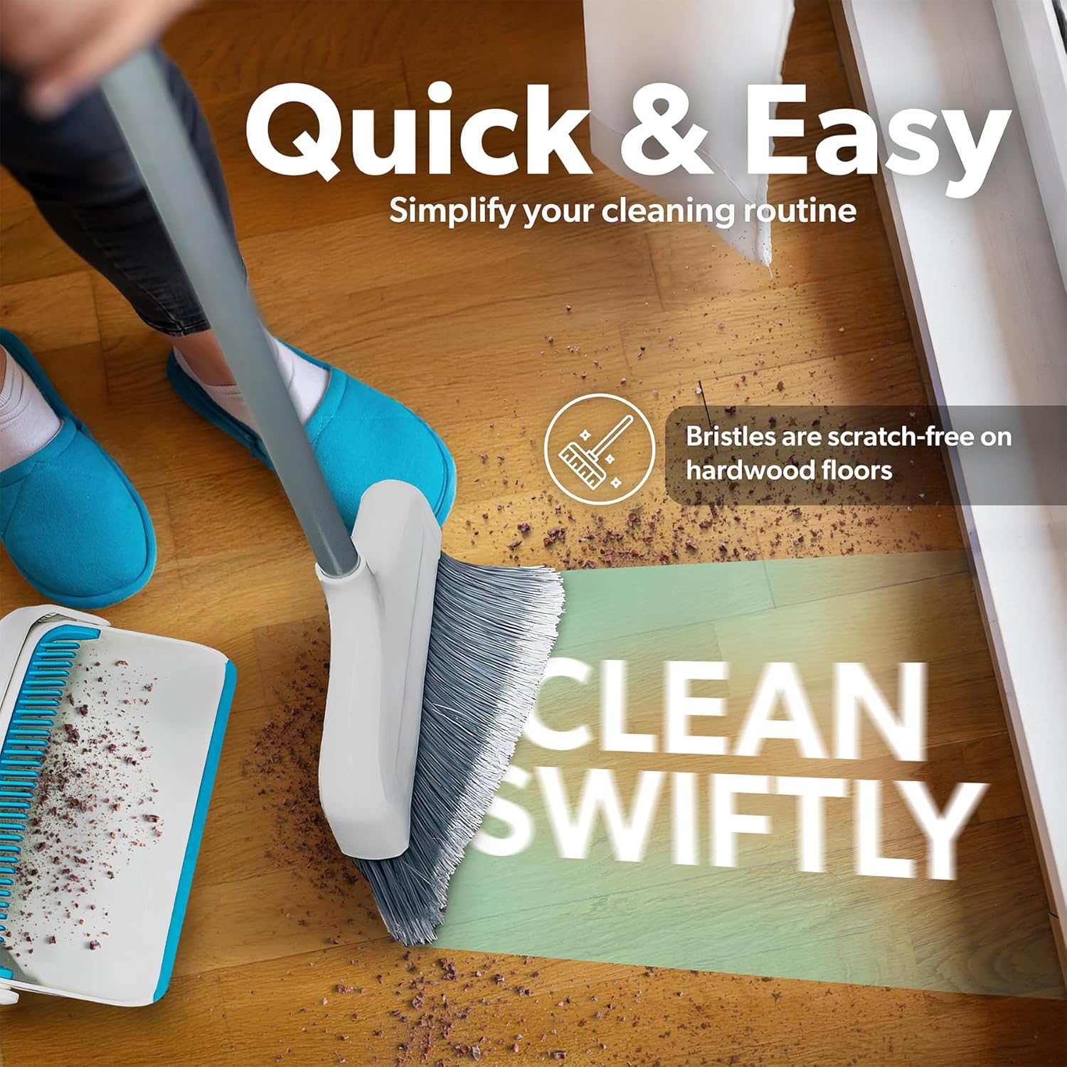 - Self Cleaning Comb Design - Sturdy teeth at the top of the dustpan comb the broom, when it collects hair/dust/lint which usually gets tangled into the bristles. Otherwise, you would need to remove them manually - not the most pleasant experience. The dustpan has a rubber lip and seamlessly sticks to the floor. It picks up everything, including the smallest particles, in the first swoop, so you will finally spend less time cleaning - more time living!