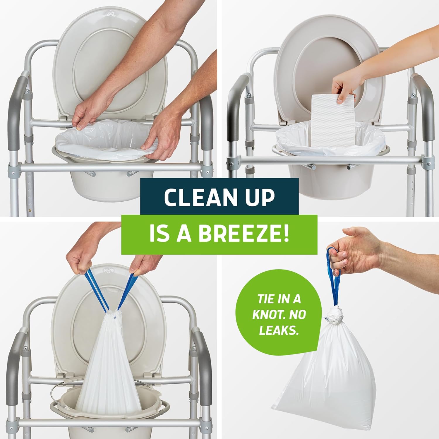 - Easy To Use And Easy To Dispose Of: Simply remove the commode liner with the aloe scented super absorbent pad by pulling on the strings, tie up the bag opening to eliminate odors, and easily dispose of them. They just make clean up a breeze.