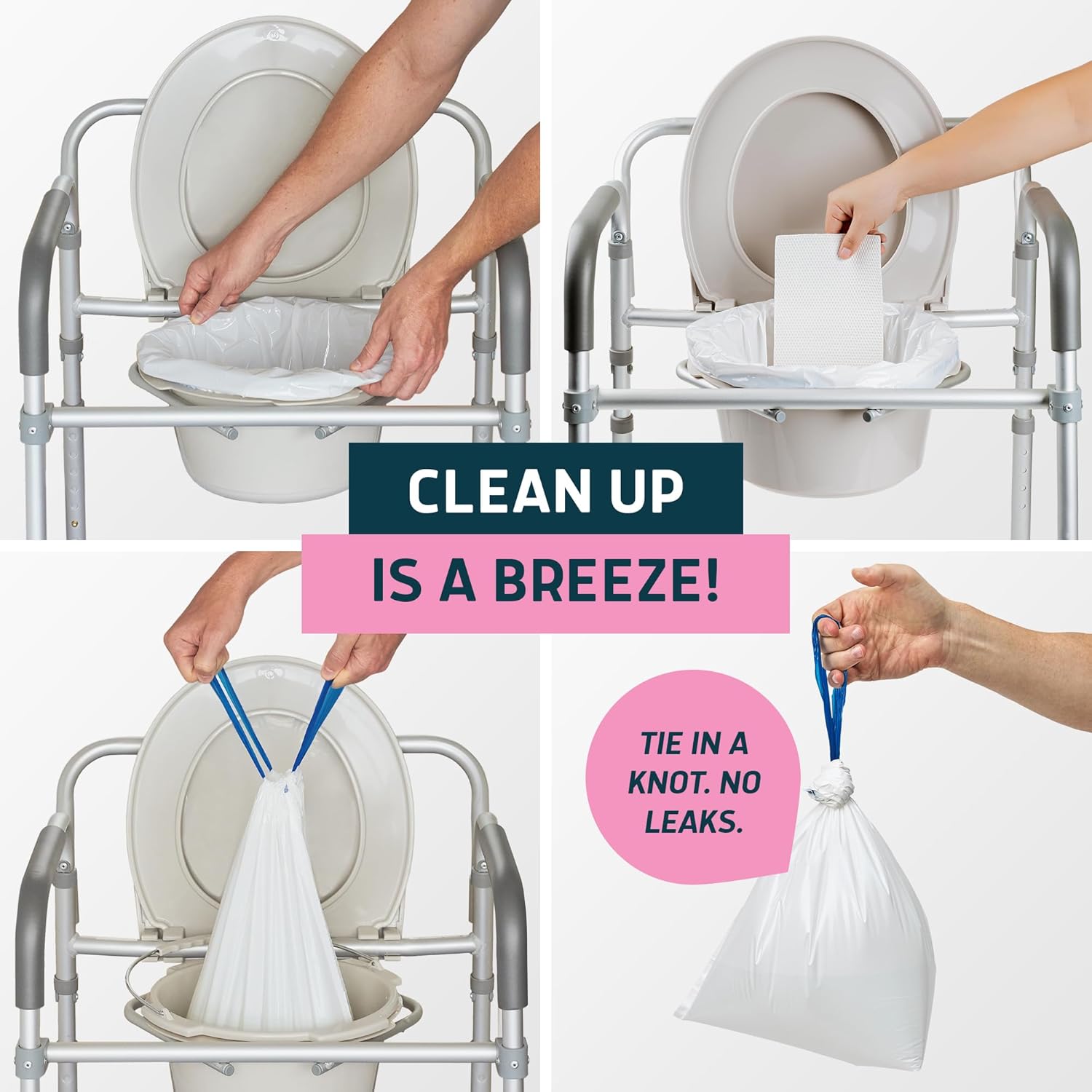 - Easy To Use And Easy To Dispose Of: Simply remove the commode liner with the rose scented super absorbent pad by pulling on the strings, tie up the bag opening to eliminate odors, and easily dispose of them. They just make clean up a breeze.
