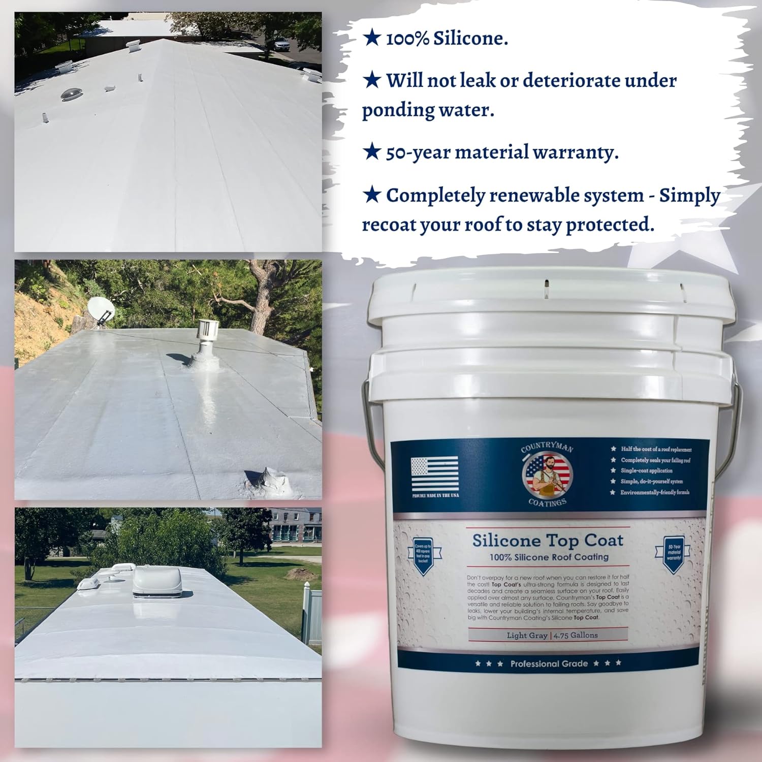 - RESTORE, PROTECT, AND EXTEND THE LIFE OF YOUR ROOF - Countryman Coatings Silicone Top Coat can be applied via roller, brush, or spray equipment directly to: Metal, Modified-bitumen, EPDM, Smooth-surface built-up, Gravel surface built-up, Single-ply (PVC, TPO), Granulated cap sheet, Spray foam, Concrete, Acrylic coatings, Silicone coatings, Elastomeric roof coatings, Urethane coatings, and more. If your roof is aging or failing but in good structural condition, Countryman Coatings can help.
