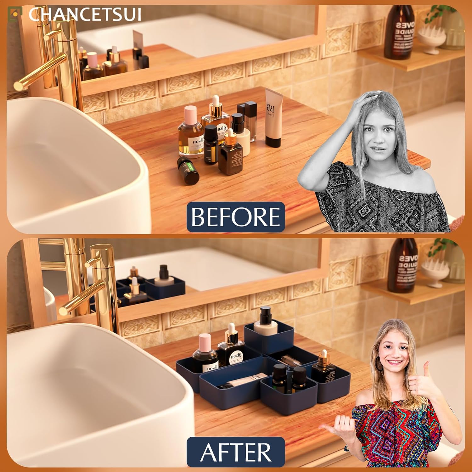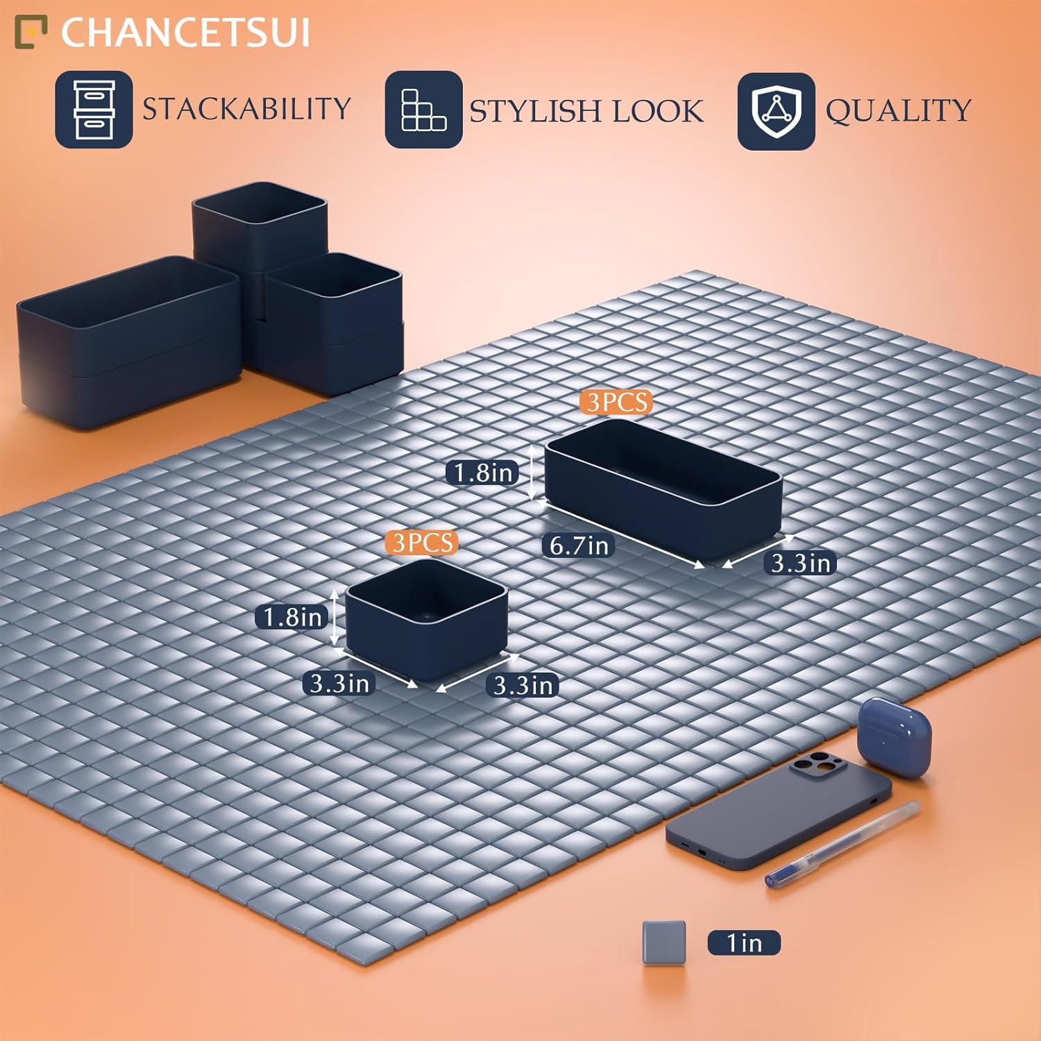 - 【6 Pcs Set 】This multifunctional organising trays comes in a 6 pcs set. Package includes : 3.35 x 3.35 x 1.77'' (3 pcs), 3.35 x 6.6 x 1.77'' (3 pcs). You can flexibly use our storage organizer for house organization and storage according to your needs.