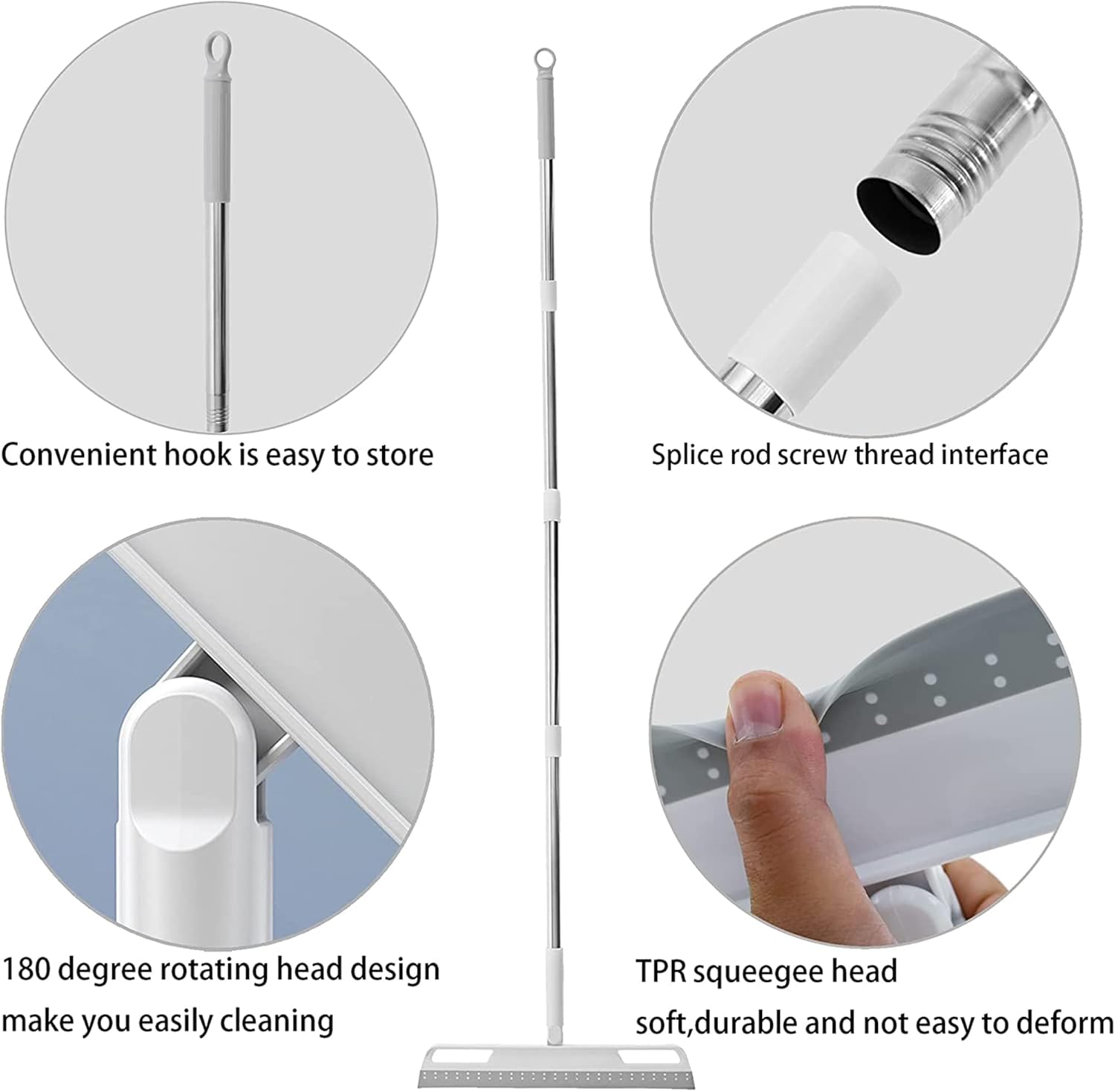 - Perfect for Cleaning: Use the upgraded magic squeegee broom works perfectly for carpet, rug and floor cleaning, living room, kitchen, hard floor, tiles, swimming pool, garage, bathroom, can also be used as a window squeegee cleaning spray glass wiper. Floor squeegee broom is 14.96in long, It effectively sweeps out strands of hair, dust, sand, pieces of broken glass, water, oil, foam, any liquid, etc. The silicone head adheres to the floor and sweeps out everything without missing anything.