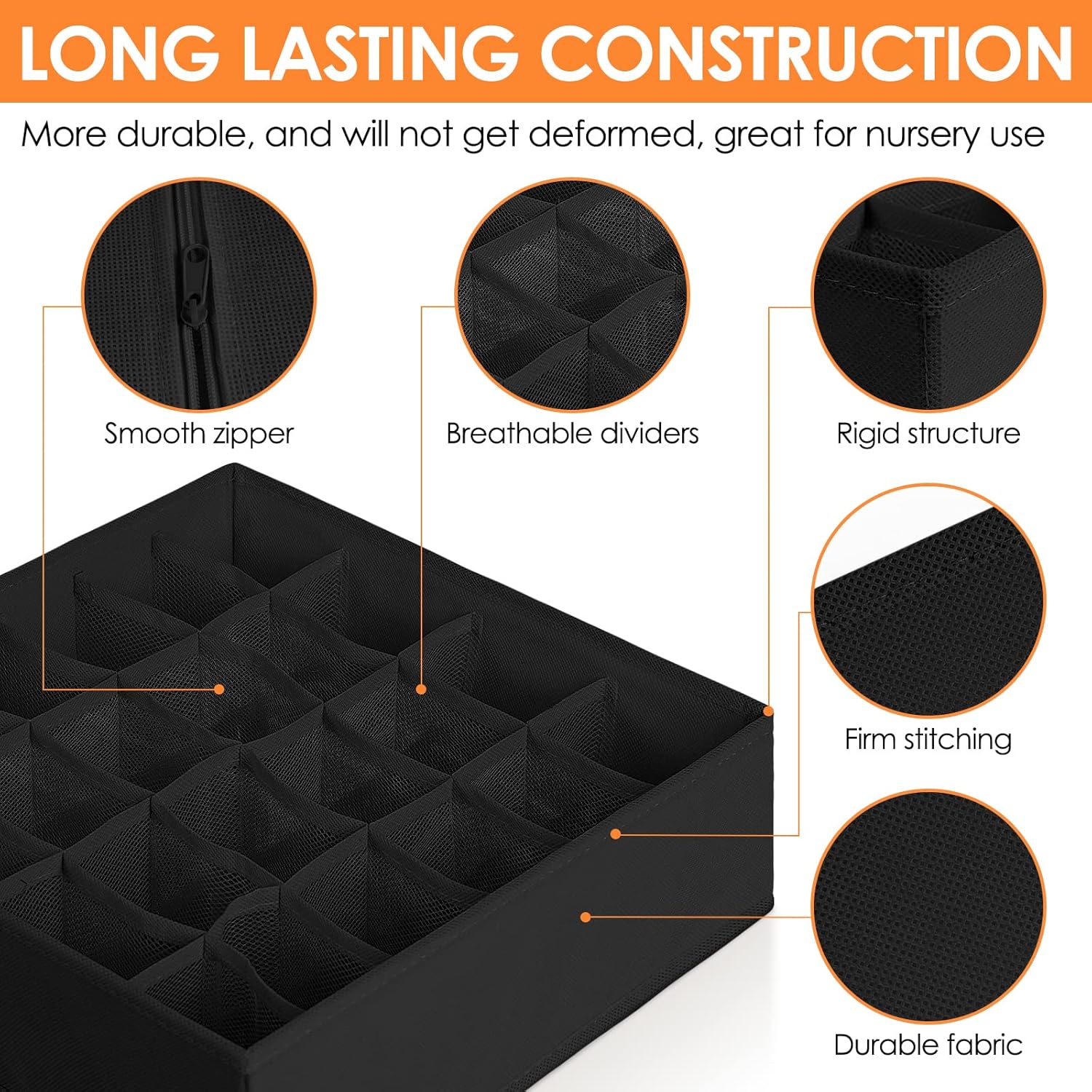 6 Pack Sock Underwear Drawer Organizer Dividers, 58 Cell Foldable Fabric Dresser Closet Organizers and Storage Bins for Clothing, Baby Clothes, Bra, Panty, Scarf, Ties (Black)
