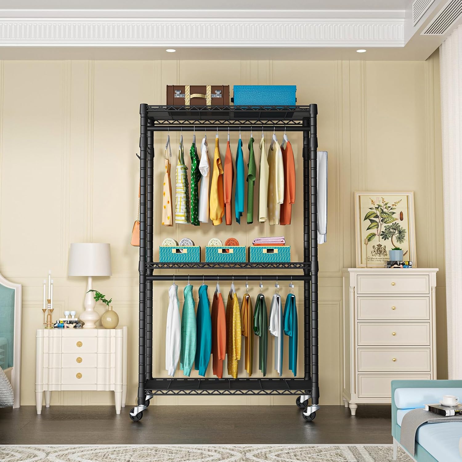 - [Multifunctional Space Saver]: 3 adjustable wire shelves and 2 metal hanger rods offer a 450 pounds storage space for most of the clothes. It’s suitable to place in the bedroom, laundry room, cloakroom, garage, living room, and other places you want