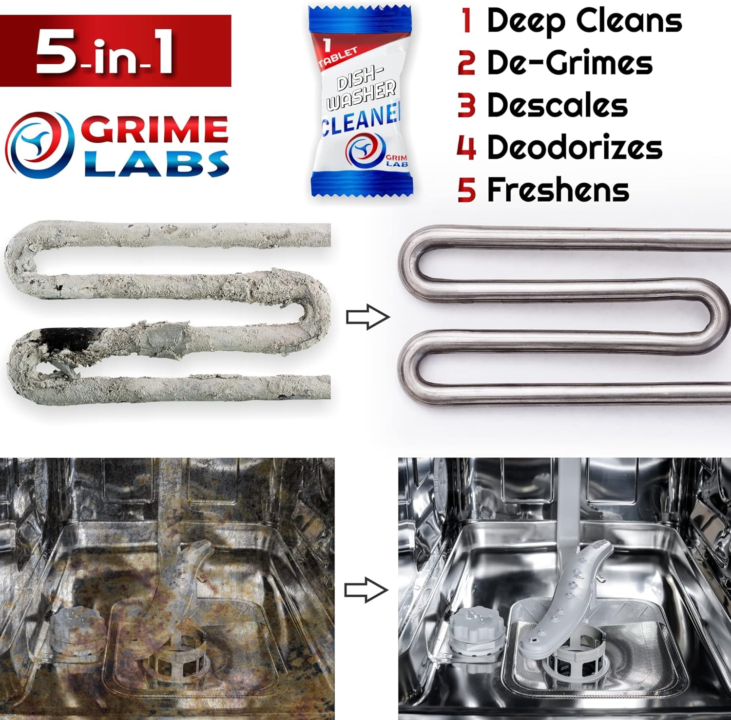 - Specific Uses For Product : Dishwasher cleaner, deodorizer and descaler tablets. Removes grime, grease, food residue and limescale. Deep cleans and unclogs water sprayer jets. Freshens dishwasher Dishwasher cleaner, deodorizer and descaler tablets. Removes grime, grease, food residue and limescale. Deep cleans and unclogs water spray… See more