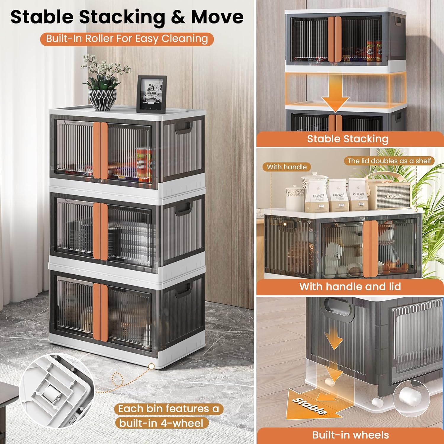 - Stable Stacking & Move: Each storage bin features a built-in recessed 4-wheel base that can move side-to-side, with a full-ground contact design for enhanced stability. The lid of each bin includes 4 built-in grooves for secure stacking