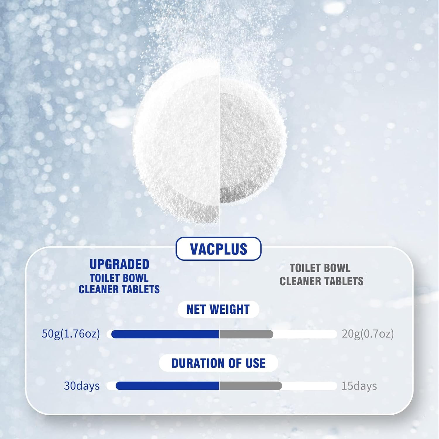 - LASTINGLY CLEAN: With an upgraded capacity of 50g each, a Vacplus toilet cleaner with bleach continuously cleans the toilet for up to 30 days. With 6 packs for replacement use, Vacplus toilet tablets can keep the toilet bowl fresh for more than 6 months.