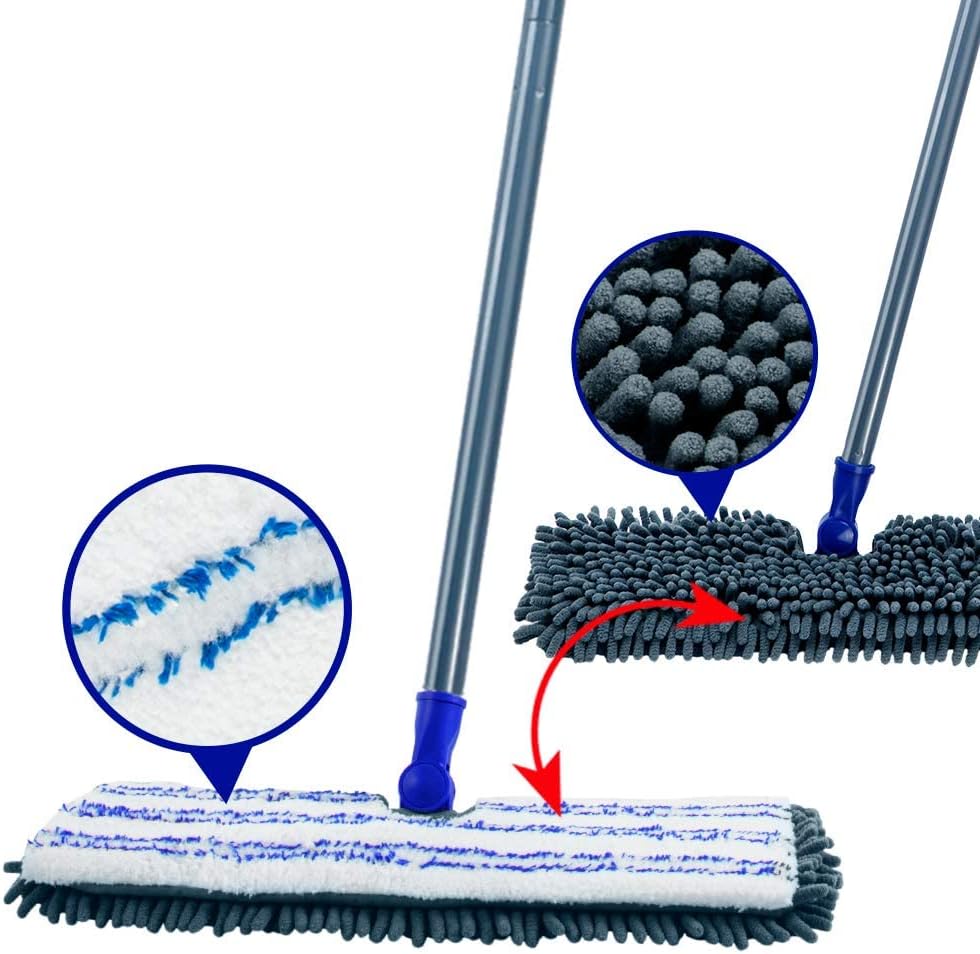 - Effective Cleaning:The microfiber mop head is good at absobing water and grabbing small pieces of dust, dirt, pet fur, hair and other waste during cleaning. Also, the chenille fabric is soft enough not to leave scratches.
