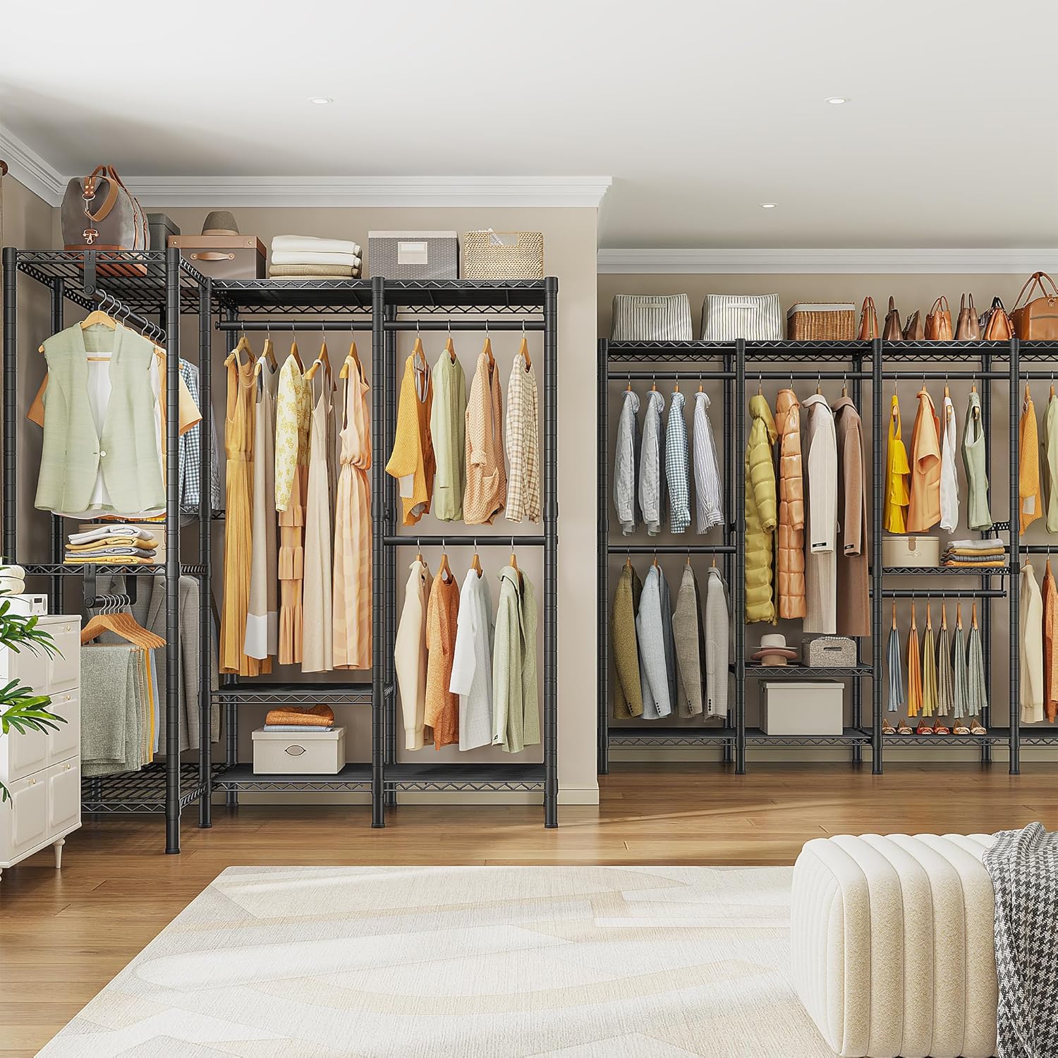 - 【Sturdy】The clothes rack is solid and extremely sturdy, it features stable, sturdy. Which has managed to organize all your clothing, giving you extra space for additional clothing. Easy access in bedroom, cloakroom, clothing store, laundry room and more.