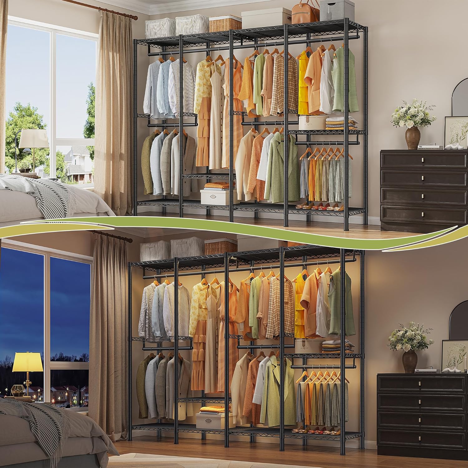 - 【Multifunction Clothes Rack】4 Tiers extra large clothes rack offers you various area to place your clothes, accessories, shoes, etc.Say goodbye to messy! The clothing racks for hanging clothes is designed to maximize your available space, providing a stylish solution to the perennial problem of clutter.