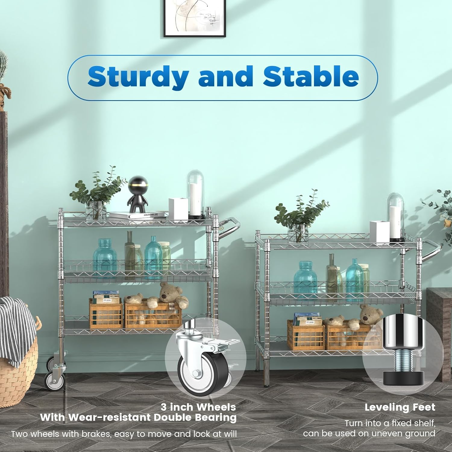 - 【Multifunctional Rolling Storage Cart】: Non-noise 4 wheels, with 2 locking brakes. * Use leveling feet, more stable and firm on uneven ground. * Use brake wheels, move the utility cart freely and can be locked. Comes with a removable handle bar, easy to push to any place. Remove the handle and use the leveling feet, this rolling utility cart will be a wire shelving unit.