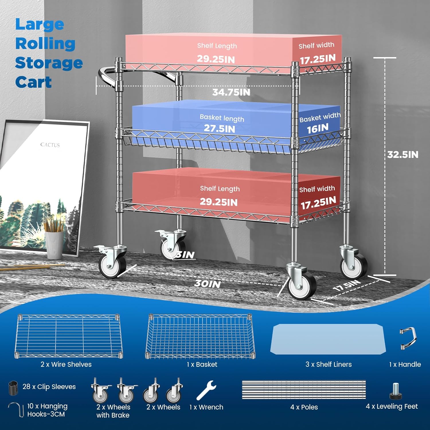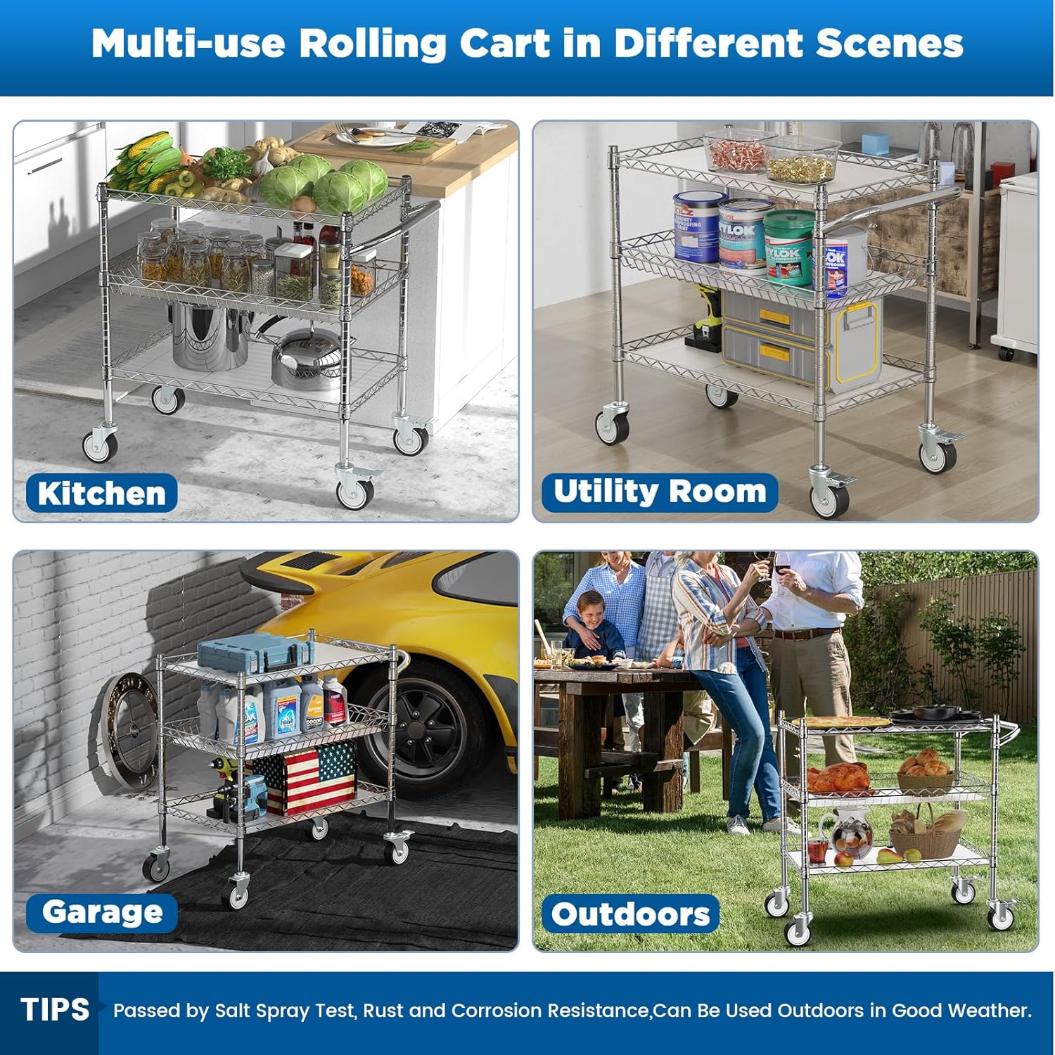- 【Easy to Assemble Metal Utility Cart】: Simple 3 tier rolling cart structure, all parts are in the package, no tools required to assemble. Our utility carts with wheels also can be used as kitchen storage cart, dining cart, service cart, tool cart, etc. Ideal for a variety of environments, like dining rooms, kitchens, restaurants, garages and utility rooms, warehouses, office and studios. NOTE: Please refer to the instruction manual for specific assembly steps.