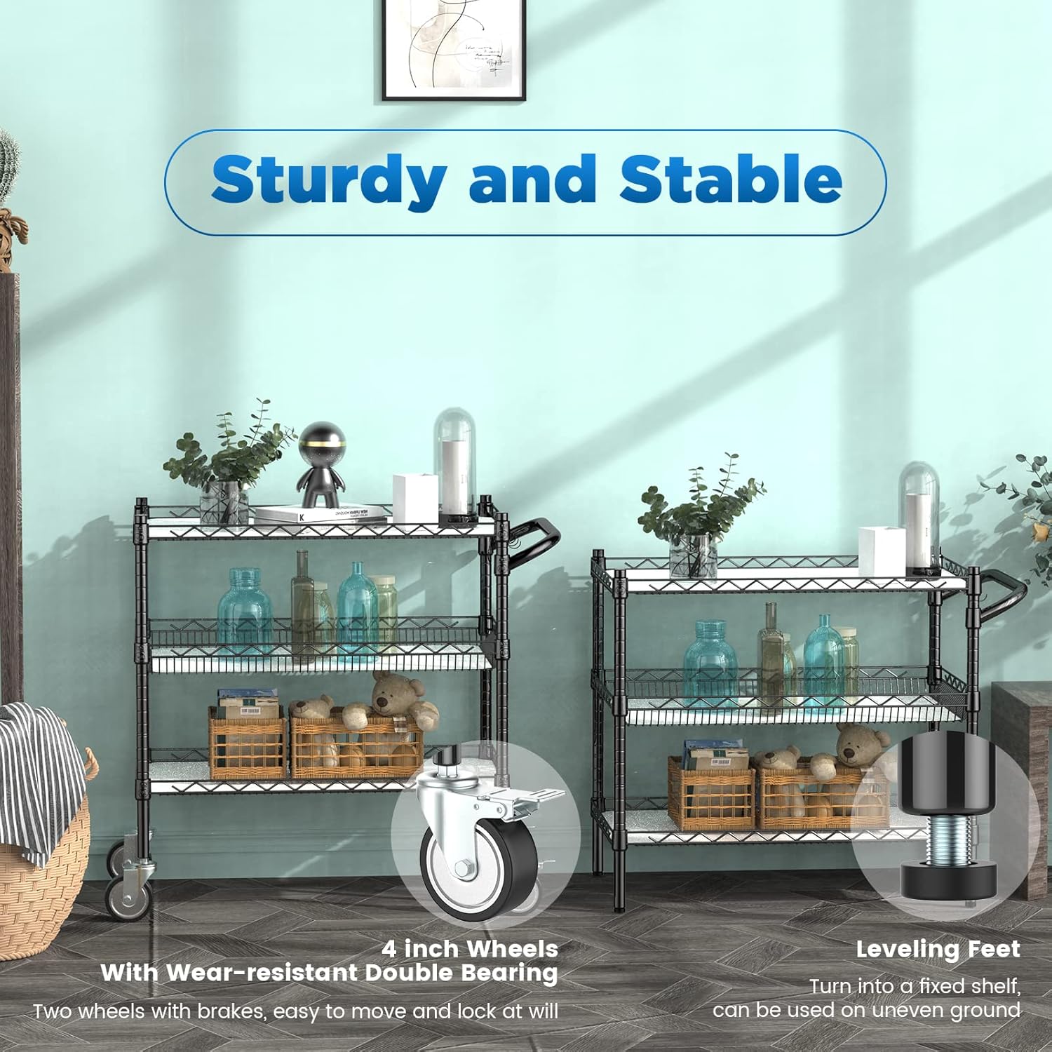 Leteuke 3 Tier Rolling Carts with Wheels,990Lbs Heavy Duty Rolling Utility Cart,NSF Commercial Grade Metal Cart with Handle&Shelf Liner,Trolley Serving Cart for Kitchen,Restaurant,Plant Display,Black