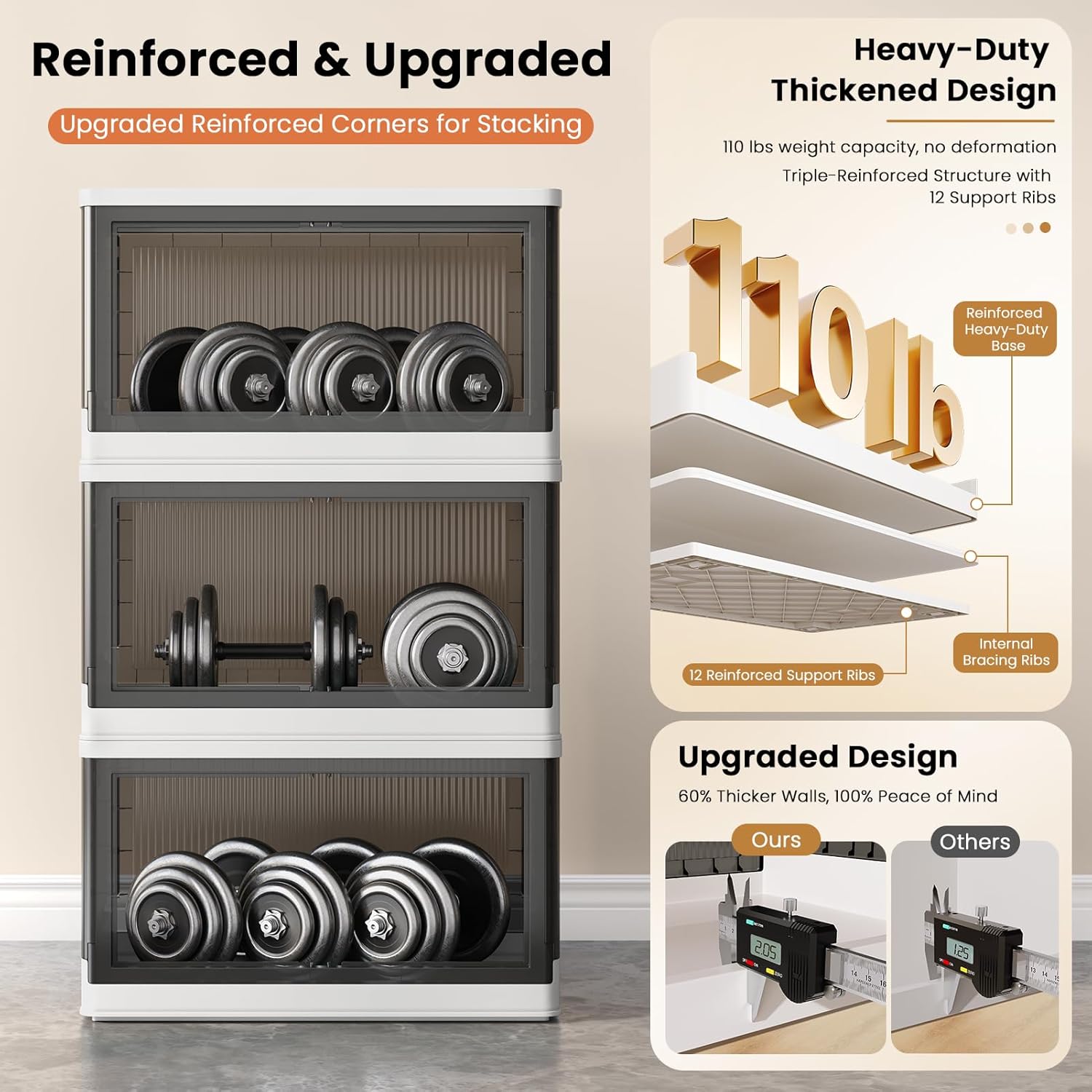 - Quick Assemble & Fold: Our storage containers can be assembled in 1 minute and folds down to 4 inches when not in use, easily tucking under beds/tight spaces—saves 80% of space. Heavy-duty PP plastic (2mm thick walls) supports 110 lbs (50 kg)/pack