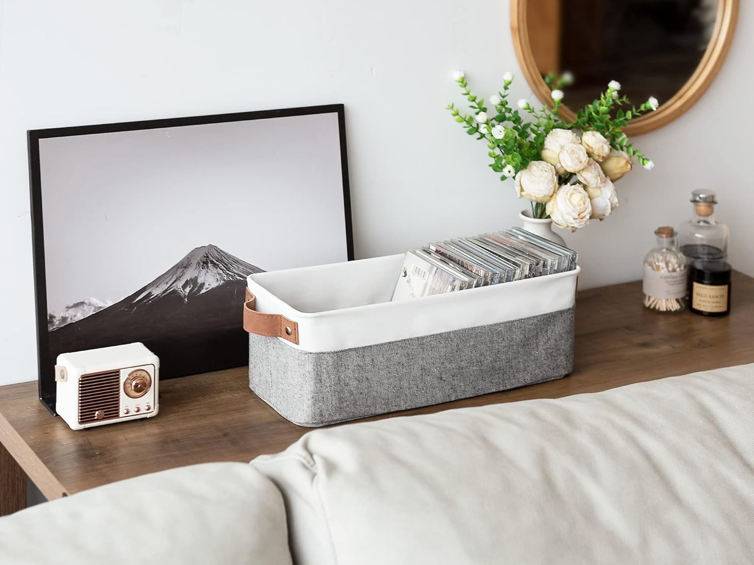 StorageWorks Narrow Storage Bins, Small Basket for Closet and Shelves, Fabric Organizer with Handles, Toilet Paper Storage, Grey and White, 2-Pack