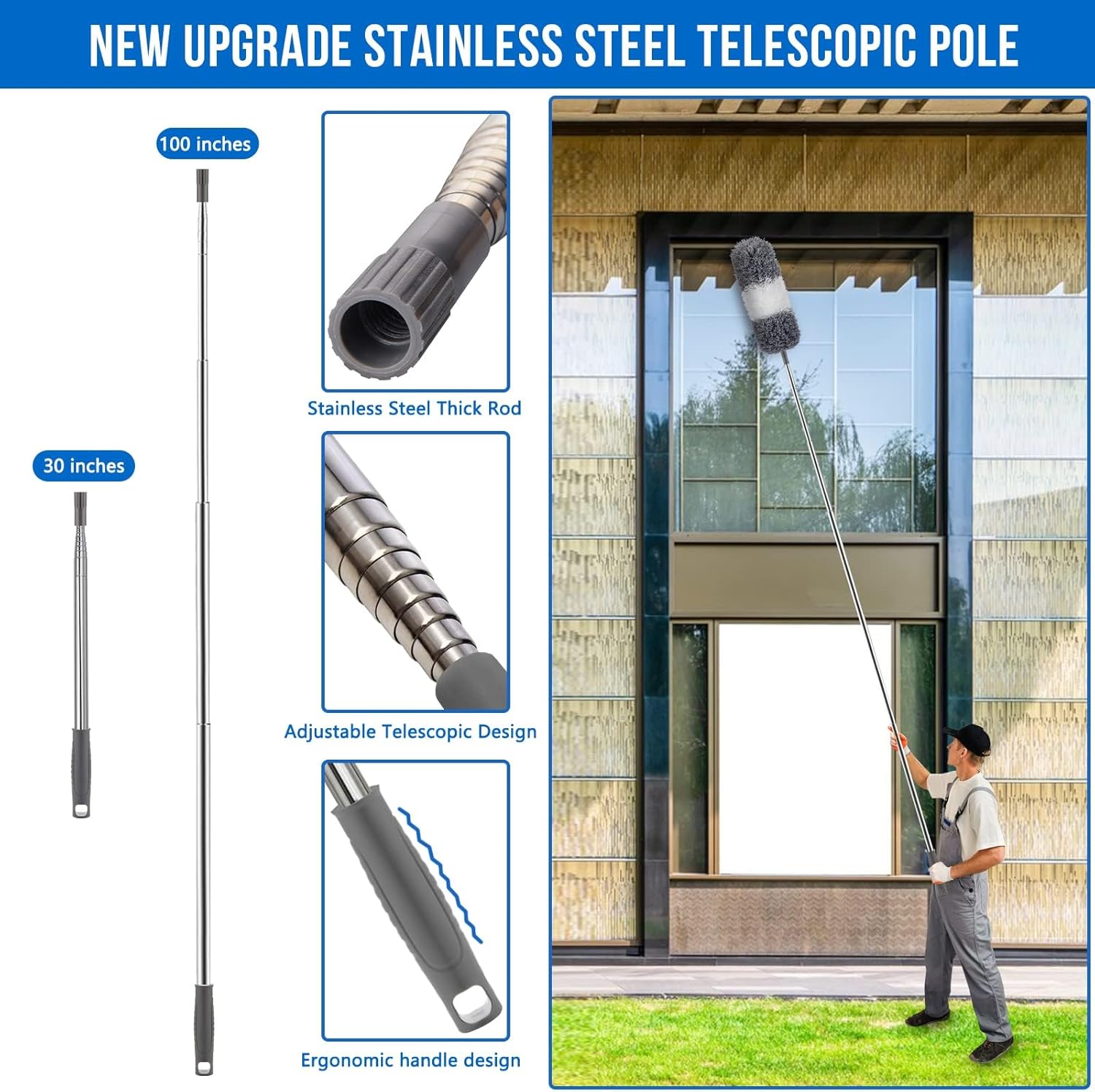 - ERGONOMICALLY LONG TELESCOPING DUSTER: The telescopic duster with a stainless steel handle extends from 30 to 100 inches, providing a sturdy, comfortable grip Reach difficult corners and gaps without climbing ladders