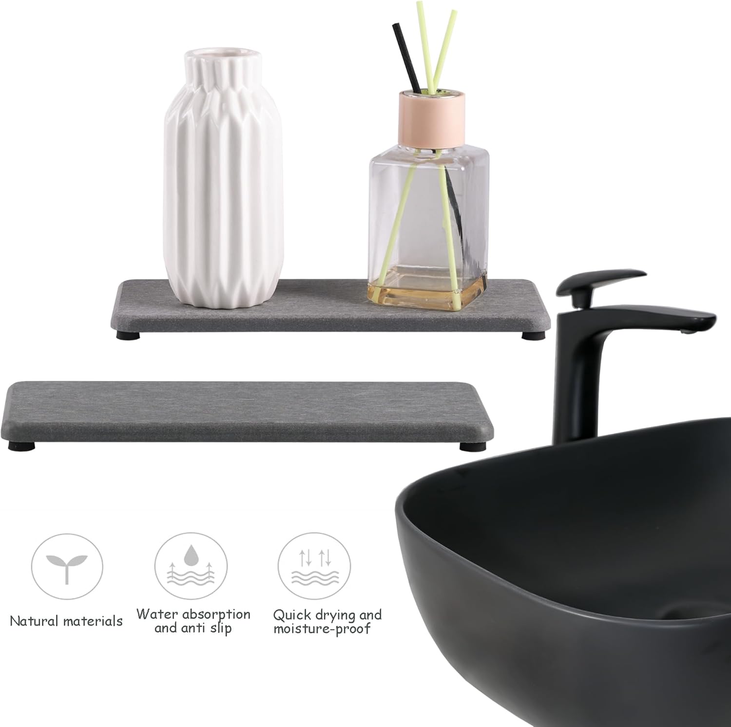 - Made from natural Diatom mud and plant fiber, small holes within diatomite enable it have amazing water absorption. They could absorb water and gets dry in a few minutes. It makes the Bathroom Counter top more dry and tidy.