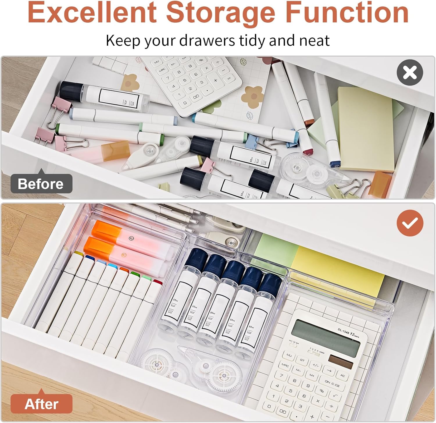 - Space Saving and Stackable Trays: Stackable drawer organizers can be stacked and sorted out in your space easily. Clear drawer organizers can save you time to organize and find your stuff, it’s easy to find and use your items in the drawer, keep your space neat, and help you get a neat lifestyle and enjoy more.
