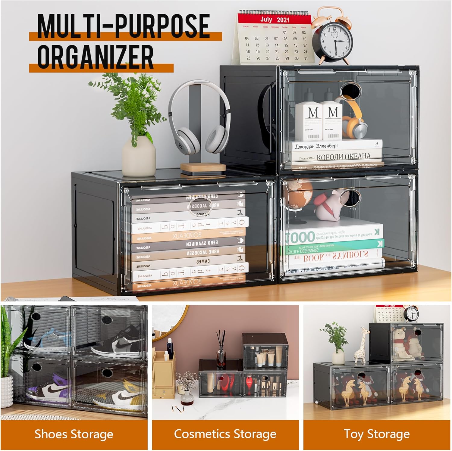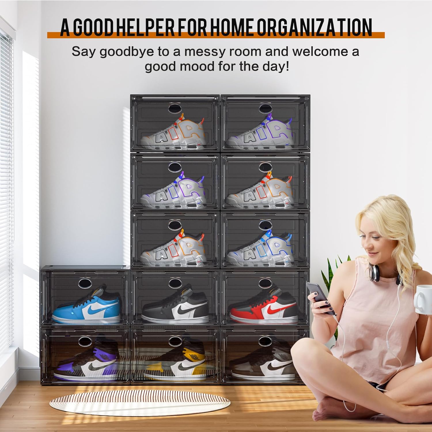 KEFA XL Shoe Storage Box Organizer, 8 Pack Shoe Boxes Clear Plastic Stackable, Sneaker Display Case Container Fit for US 13 (Side 8 PACK BLACK)