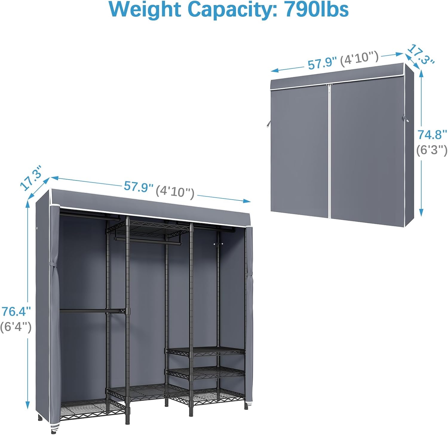 - Dimensions & Load Capacity: 57.9" L x 17.3" W x 76.4" H (includes cover). Load capacity up to 790 lbs. Single hanging rod can support up to 60 lbs, Wire shelf can support up to 88 lbs for each.